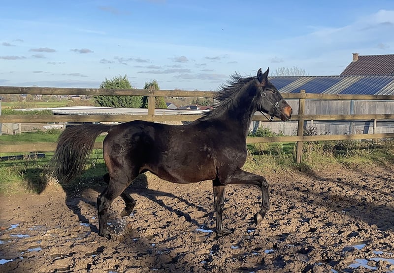 Young promise stallion with excellent uphill gaits, from a performance lineage. His mother is half sister of Figo de Hansez CDI3*, ridden by Alizée Roussel (FR) and competed herself until Level 3 / Medium and trained until Prix Saint-Georges. Rodin is really uncomplicated and kind, and accepts both saddle and rider at the lunge. No x-rays so far. Sold for lack of space and time