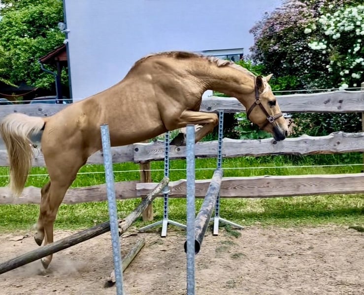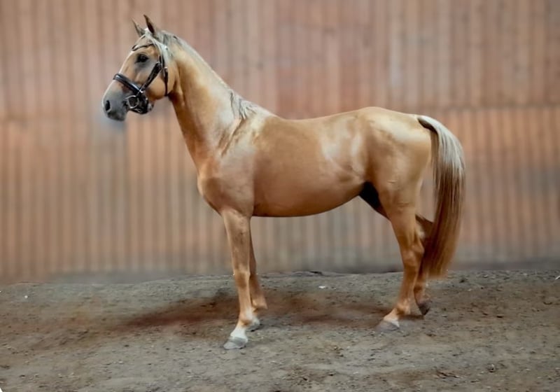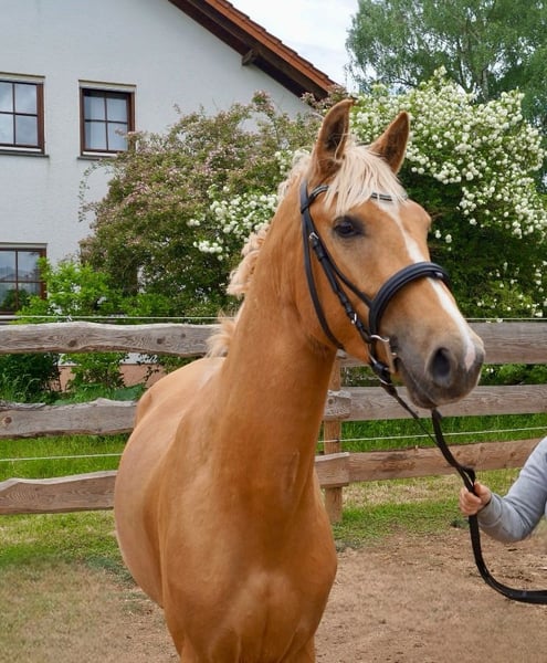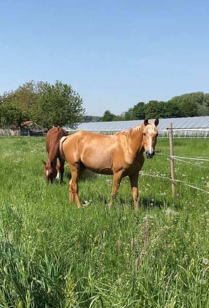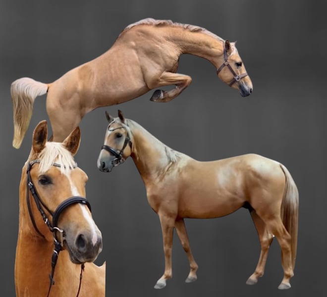 ⚜️Milano Gold – Palominohengst mit besonderer Ausstrahlung⚜️ Mit Milano Gold präsentieren wir einen jungen Hengst, der nicht nur durch seine seltene Sonderfarbe Palomino, sondern auch durch seine Veranlagung und sein Wesen begeistert. Milano Gold ist ein dreijähriger Hengst (geb. 2022), aktuell ca. 1,55 m groß und befindet sich weiterhin sichtbar im Wachstum. Sein kompakter, sportlicher Körperbau und seine harmonischen Proportionen lassen bereits jetzt auf eine vielversprechende Entwicklung schließen. ⚜️Seltene Farbe mit genetischem Potenzial⚜️ Milano Gold trägt das begehrte Cremgen, das für die charakteristische Aufhellung sorgt – und das nicht nur optisch: Er vererbt dieses Gen mit einer Wahrscheinlichkeit von 50 %, was ihn besonders für Züchter interessant macht, die auf Sonderfarben setzen. ⚜️Erfolgreiche Körung – Talent am Sprung⚜️ Im September 2025 absolvierte Milano Gold seine Körung mit einem sehr guten Ergebnis. Besonders im Freispringenkonnte er die Richter mit viel Übersicht, Technik und Vermögen überzeugen. Seine Springanlage zeigt sich kraftvoll, klar strukturiert und mit natürlicher Intelligenz – eine ideale Grundlage für den Sport. ⚜️Top-Abstammung – doppelte Veranlagung⚜️ Milano Gold ist nicht nur optisch ein Highlight – seine Genetik spricht für sich. Er stammt väterlicherseits vom Michelangelo A der wiederum vom bekannten Magic Memphis ab, dem er sowohl die Sonderfarbe als auch Ausdruck und Präsenz verdankt. Über die Mutterseite bringt er erstklassige Springgene von Chaman und Ismo mit. Diese Kombination macht ihn doppelt veranlagt – mit besten Voraussetzungen für Rittigkeit, Springvermögen und sportliche Leistung. ⚜️Charakter zum Verlieben⚜️ Milano Gold überzeugt nicht nur unter dem Sattel oder an der Hand, sondern auch im täglichen Umgang: Ausgeglichen, menschenbezogen und unkompliziert zeigt er sich als absolut umgänglicher Partner – ein Charakter, der sowohl Profis als auch ambitionierte Amateure begeistert. Milano Gold steht ab sofort für alle Stuten (alle Farben) zur Verfügung. Decktaxensplittung: 200€ + 300€ bei Trächtigkeit. Bei Interesse an Deckeinsätzen oder weiteren Informationen freuen wir uns über Ihre Kontaktaufnahme!