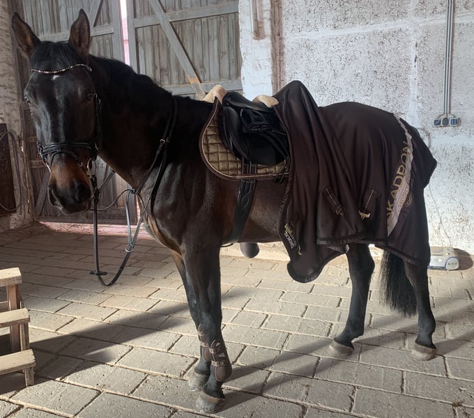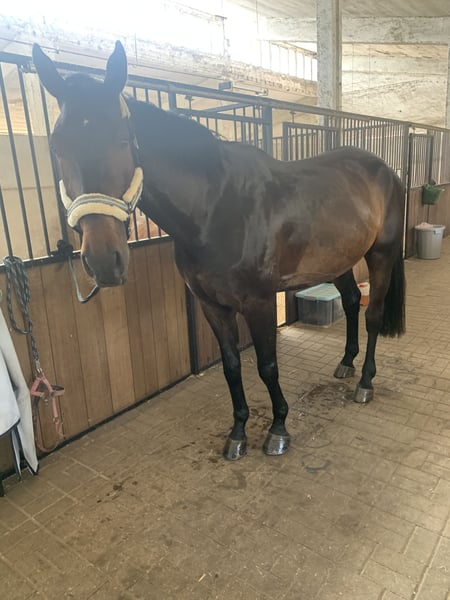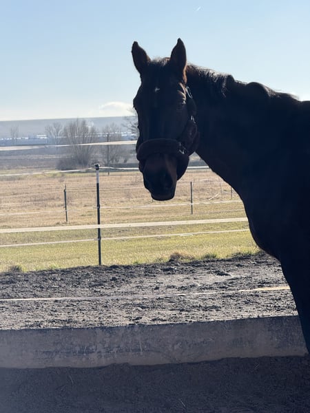 For sale is an 11-year-old English Sport Horse, gelding, with a height of approximately 1.73m. I am selling Castro because I simply cannot handle him as a rider. I am a very anxious rider, and he is a very insecure yet dominant horse when being ridden, which is unfortunately not a good combination. In handling, he is absolutely reliable, always relaxed and manageable. Whether grooming, preparing, or going for a walk, he is easy to load and can be presented to the farrier without any problems. He gets along well with everyone and can be turned out either alone or in a group. The real issue with him is the riding. He shows a lot of dominance in this area and finds it very difficult to submit. Especially at the beginning, he tests his rider, but if you show him that you can handle him, this issue resolves relatively quickly. He is a very intelligent horse who likes to anticipate tasks and sometimes decides for himself what to do next. He has good basic gaits with plenty of forward energy. He also shows great motivation when jumping and always wants to get to the other side, but he can get quite hot quickly. However, he becomes insecure when he cannot execute a task as the rider demands and tends to evade the aids. Even though he is a bit special, he goes out alone as well as in a group and has always shown great bravery and is not spooky in the terrain. Working from the ground is absolutely no problem. He enjoys ground work very much and is always motivated, hoping for the occasional treat. Therefore, it is important: No beginner or children's horse! Under saddle, he can be temperamental and energetic, so I am looking for an experienced rider with the appropriate know-how. Unfortunately, Castro has a clinical finding in the hind hock. However, this has been clarified by a veterinarian, and he is fully rideable in all disciplines. He is currently not being ridden but is only being worked from the ground, as I do not have anyone to ride him at the moment, and I do not dare to do so myself. For further inquiries, feel free to message or WhatsApp me at 015208717206.