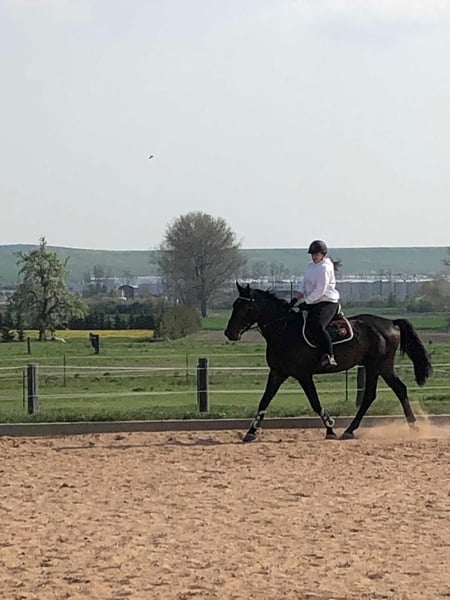 Zum Verkauf steht ein 11-jähriger Englisches Sportpferd, Wallach mit einem Stockmaß von ca. 1,73m. Ich Verkaufe Castro da ich ihm reiterlich einfach nicht gewachsen bin. Ich bin eine sehr Ängstliche Reiterin und er ein sehr unsicheres und dennoch dominantes Pferd beim reiten, das ist leider keine gute Kombination. Im Umgang ist er absolut zuverlässig, zu jederzeit entspannt und händelbar. Egal ob beim putzen, fertig machen oder Spazieren gehen. Er lässt sich ohne Probleme verladen oder beim Schmied vorstellen. Er ist mit allen verträglich, kann so wohl allein als auch in der Gruppe raus gestellt werden. Das eigentliche Problem bei ihm ist das reiten. Da er sich dort sehr dominant zeigt und es ihm sehr schwer fällt sich unterzuordnen. Gerade am Anfang testet er seinen Reiter aber wenn man ihn dort zeigt, das man ihm gewachsen ist. Das hat sich das auch relativ schnell erledigt. Er ist ein sehr intelligentes Pferd was einem auch die ein oder andere Aufgabe vorwegnehmen möchte und auch gern mal selber entscheidet was als Nächstes gemacht wird. Er Besitz gute Grundgang Arten mit ordentlich Go nach vorn. Auch beim springen zeigt er ich sehr motiviert und möchte auch dort immer auf die andere Seite, wo er allerdings schnell heiß wird. Dennoch wird er auch schnell unsicher wenn er eine Aufgabe nicht so korrekt umsetzten kann, wie es der Reiter verlangt und flüchtet dann gern vor den Hilfen. Auch wenn er etwas spezieller ist geht er so wohl allein als auch in der Gruppe ins Gelände und zeigte sich dort immer sehr mutig und nicht schreckhaft. Das Arbeiten vom Boden aus ist absolut kein Problem. Gerade die Bodenarbeit macht ihm viel Spaß, dort zeigt er sich immer sehr motiviert und hofft auf das ein oder andere Leckerchen. Somit ist Wichtig: Kein Anfänger- oder Kinderpferd! Unter dem Sattel kann er temperamentvoll und energisch sein, daher suche ich einen erfahrenen Reiter mit entsprechendem Know-how. Castro hat leider eine klinischen Befund am hinteren Sprunggelenk. Das ist aber alles Tierärztlich abgeklärt und somit voll Reitbar in allen Sparten Er wird momentan nicht geritten, sondern nur vom Boden aus gearbeitet. Da ich momentan niemanden habe der ihn reiten könnte und ich es mich nicht traue. Für weiteres gern per Nachricht oder per WhatsApp 015208717206