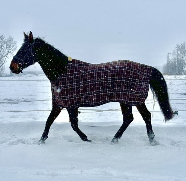 Na sprzedaż 11-letni koń sportowy angielski, klacz, o wzroście około 173 cm. Sprzedaję Castro, ponieważ nie jestem w stanie sprostać jego jeździeckim wymaganiom. Jestem bardzo lękliwym jeźdźcem, a on jest bardzo niepewnym, ale jednocześnie dominującym koniem podczas jazdy, co niestety tworzy niekorzystną kombinację. W obsłudze jest absolutnie niezawodny, zawsze spokojny i łatwy w prowadzeniu. Niezależnie od tego, czy chodzi o czyszczenie, przygotowanie do jazdy czy spacer, można go bez problemu załadować do przyczepy czy przedstawić kowalowi. Jest kompatybilny ze wszystkimi i może być wyprowadzany zarówno sam, jak i w grupie. Głównym problemem jest jazda. Koń wykazuje dużą dominację i ma trudności z podporządkowaniem się jeźdźcowi. Zwłaszcza na początku testuje swojego jeźdźca, ale gdy pokazuje mu się, że jest się od niego silniejszym, sytuacja szybko się poprawia. To bardzo inteligentny koń, który czasami chce samodzielnie decydować o kolejnych krokach i potrafi przewidzieć, co będzie się działo dalej. Ma dobre podstawowe chody i energicznie się porusza do przodu. Podczas skoków również jest bardzo zmotywowany i chce zawsze dotrzeć na drugą stronę, choć potrafi się wtedy szybko podniecić. Jednakże staje się też niepewny, gdy nie może wykonać zadania tak, jak tego oczekuje jeździec, i chętnie ucieka od pomocy. Mimo że jest trochę bardziej wymagający, radzi sobie zarówno w terenie solo, jak i w grupie, wykazując się odwagą i brakiem strachu. Praca z ziemi nie stanowi dla niego problemu. Szczególnie lubi pracę na lonży, wykazuje dużą motywację i chętnie liczy na smakołyki. Ważne: Nie jest to koń dla początkujących ani dla dzieci! Pod siodłem może być energiczny i pełen temperamentu, dlatego szukam doświadczonego jeźdźca z odpowiednią wiedzą. Castro ma niestety stwierdzony klinicznie uraz w tylnym stawie skokowym. Zostało to jednak potwierdzone przez weterynarza i nie stanowi przeszkody w jeździe w różnych dyscyplinach. Obecnie nie jest użytkowany w jeździe, a jedynie pracuje na ziemi, ponieważ nie mam nikogo, kto mógłby go jeździć, i nie czuję się na siłach. W razie pytań proszę o kontakt przez wiadomość lub WhatsApp: 015208717206.