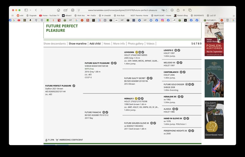 Prospekt na wysokim poziomie w skokach przez przeszkody! Future Perfect Pleasure (stajenne imię Rupert) to 4,9-letni wałach. Składa się w 71% z krwi wyścigowej Thoroughbred i jest vice-mistrzem podczas licencji AES, uzyskał znakomite oceny za budowę i swobodne skoki (ogólna ocena 8,13 – pierwsza klasa, z ocenami za skoki 8,25, galop 8,5, kłus 8,25, spacer 7,5, budowa 8). Jego ojcem jest Future Guilty Pleasure (Levisonn/Cantoblaco), młody ogier w Wielkiej Brytanii, wielokrotny mistrz własnych ocen AES w UK, najlepszy ogier hodowlany w wielu dyscyplinach na brytyjskich pokazach Futurity przez kilka lat, bardzo popularny jako ogier hodowlany wśród czołowych brytyjskich i zagranicznych jeźdźców startujących w skokach. Matka pochodzi od Heralda 3 (Heraldik xx/Lorentz) z linii Future Golden Glove xx, który z kolei jest potomkiem Hand in Glove xx, ojca wielu znakomitych koni skokowych i wszechstronnych, z najbardziej znanym synem Jaguar Mail. Future Golden Glove xx jest także matką innego ogiera zatwierdzonego w AES w Wielkiej Brytanii, Future Prophecy xx. Rupert jest bardzo towarzyski, inteligentny, ale też wrażliwy. Wciąż potrzebuje dużo cierpliwości i powolnego wprowadzania w sport. Obecnie jest w treningu z profesjonalnym jeźdźcem na poziomie wyższym, stanowi doskonały kandydat do startów na najwyższych poziomach w skokach przez przeszkody. https://www.horsetelex.com/.../future-perfect-pleasure