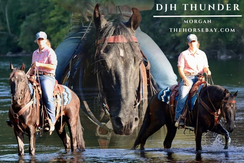 DJH Thunder is his registered name we just call him DJ. He is a registered Morgan gelding standing at 15 hands tall. He is jet black so far, he stays black and doesn’t bleach out like most blacks do in the summer. He has a nice chunky build and a sharp looking head. DJ both RIDES & DRIVES! And he is safe and fun for both sports. Not only that but he has a puppy dog personality to boot! DJ is very easy to catch out in the pasture he is so very friendly he won’t leave you alone. If he sees you he normally comes running up to greet you. And you can work him 6 days a week straight and he’ll still catch himself that’s how friendly and personable he is. He’s so personable he even loves Tramp the dog. I have caught him licking Tramps head if he gets too close. And he doesn’t care a bit about Tramps antics whenever that dog comes running full speed up behind us DJ NEVER spooks at it. And Tramp will also jump off the river/creek banks and make a big splash right behind DJ and he doesn’t mind. Tramp even loves this horse so much he goes out and tries to get DJ to play chase with him. So basically DJ acts like a big dog most of the time and he loves dogs too. We bought DJ straight from the breeder so there are NO unknowns with him you get his full story. And currently DJ is 15 hands, but he’s still growing so he may get a little taller yet most Morgans are slow growing and don’t finish until 6yrs of age. DJ has more of that older style Morgan bloodlines that are so hard to come by. I love the older style because they just have a better personality, build, and brains. And DJ is really doing a good job of showcasing his breed. DRIVING: He stands excellent for hitching, unhitching, stop signs/lights, and getting on/off the cart. He is absolutely Traffic SAFE. He does NOT care a bit about motorcycles, bikers, big trucks, and semis as you’ll see in his video. He is NOT easily spooked and makes a handy horse to have around if you want to drive into town to the store and back. He stands good at the hitching post and waits patiently. And the thing I love most about this horse is… When I get back from driving DJ. He just stands perfectly still and NOT tied while I unhitch everything. Then I just take his harness off put it all in my cart. And the last piece I take off is his headstall because as soon as the headstall comes off he turns around and follows me with NO rope or halter on back to his pasture. That is how easy he is to handle. RIDING: Talk about smooth he is VERY smooth. On a side note he actually gaits sometimes, but he mostly trots. So he is one of those RARE gaited Morgans. But he prefers to trot and we have not taught him to stay in a gait so he only gaits if he’s feeling like it. So I’m not selling him as gaited, but it is a possibility if someone wants to take the time to work on his gait. But his trot is so smooth you would think he’s foxtrotting. I barely ever post to his trot it’s that smooth I pretty much sit it the whole way. And his canter is EXTREMELY smooth too. He will go anywhere I point him up and down steep banks NO problems. He will cross logs, bridges, creeks, rivers, and loves to play in the lake. He really loves the water he sticks his nose under and likes to blow bubbles out. He really acts so much like a big puppy sometimes it’s funny. VERY curious loves to check things out. Does NOT spook easily out on the trail and he’s quite used to Tramp the dog dodging in and out through the brush and running up fast behind him and passing him and anything that dog can do to spook a horse Tramp does. But DJ never spooks at him. If you are a Morgan lover like myself you will love DJ. And if you are not a Morgan person I will warn you. Once you ride/drive DJ you’ll never go back to any other breed. It’s hard to find all the good qualities combined into one horse, but with DJ you have it. And you seriously won’t ever want a different type of horse after owning DJ he will spoil you. I hate to sell him, but I can’t keep him otherwise believe me he would not be up for sale. And he has NO bad habits or vices. And again does NOT spook easily. There is only one thing he doesn’t like and that is manhole covers if you are driving him they look like a big hole. And honestly just about any horse I have ever driven through town doesn’t like those because they look like a hole to fall in so he’ll go around them just not overtop them. And that is the only thing he doesn’t like. This guy has a lot of brains and sense for a horse his age and being this good he can only get better. There are very few young horses that I will drive. I’m a better rider than driver so if I drive they have to be SAFE and Sane and DJ I trust he has never given me any reason not to. And he is a steady trail partner out on the trail too.