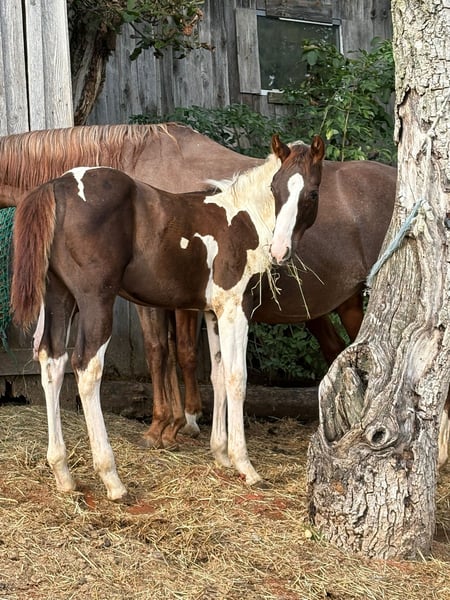 !!!Price absolutely negotiable!!! Priority over price!!! Our little Henry is looking for a new 5-star home. Henry was born at the end of April 2025. His mother is the Quarter Horse mare "Razalena Blaze" (grandfather Jac O Rima, great-grandfather Hollywood Jac 86), and his sire is the Paint Horse stallion "Grab Your Okie Boy," a direct son of Dancing Boys Okie. This little guy will receive APHA papers (application in progress), a PHCG passport, and is genetically n/n through his parents for all tested genes. However, a parentage panel test will still be conducted. Currently, he is growing up in a herd with older and younger horses in an open stable. He is well socialized. He will be ready to leave at the end of October. Henry has been regularly dewormed, is tetanus vaccinated at the time of sale, and has been regularly introduced to the farrier. This little fellow is located at home in 94424 Arnstorf.