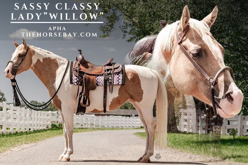 OPEN BIDDING ON THEHORSEBAY,COM. SALE ENDS ON 04/23. More information is available on the website, including an UTD vet inspection, Coggins, video, images, and the owner's contact information to ask questions, request information, or make arrangements to come to visit. Introducing Willow, a 2015 APHA mare who brings joy and confidence to children and adults alike. She is among the finest horses I have ever bred and raised, and I take immense pride in her. Standing at 14.3 hands, Willow moves with the grace of a warmblood. She was professionally started at the age of two by KB Performance Horses. Throughout her training, we have engaged in various activities, including beginner lessons for children, trail riding, western dressage, ranch riding shows, cattle sorting, and even driving! Willow is a stunning mare seeking a lifelong partner who will appreciate her. She is the type of horse that can take a year off and still be trailered out for a ride without any issues, always ensuring her rider’s and family’s safety. With excellent ground manners and a calm demeanor under saddle, she is easy to care for and loves being groomed. Willow is also well-behaved for the farrier, vet, and during clipping. As we are downsizing, I am eager to find the right person for Willow. She has traveled along the East Coast and participated in several Western Dressage shows in Florida, achieving a high score of 77% and an average of 72% in the intro-basic level, with the potential to advance further as her rider gains confidence. Willow thrives on having a job and quickly learns patterns. She has a well-balanced walk, trot, lope, and can perform lead changes. Willow is comfortable crossing bridges and water and will self-load into a trailer. In addition to her impressive skills, Willow is a wonderful mother with a two-year-old filly in training who is excelling under her owner’s guidance. Willow is barefoot but has previously worn shoes and sliders during her reining training. She has participated in several pony camps and is always a favorite among the kids. Willow is current on all vaccinations, and I am more than happy to answer any questions you may have about her.