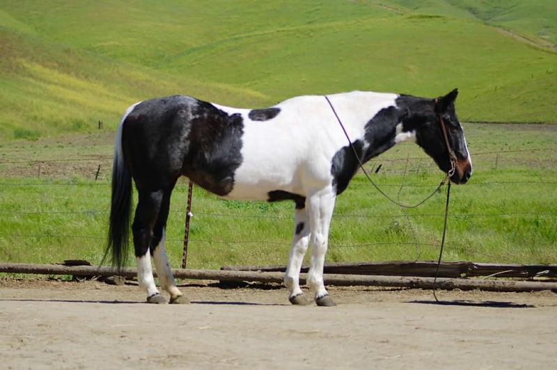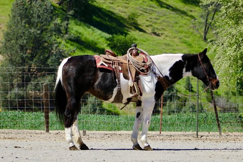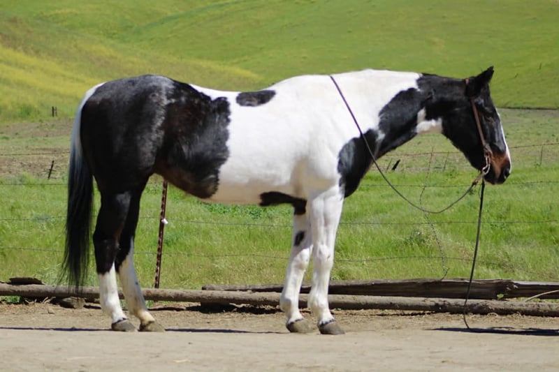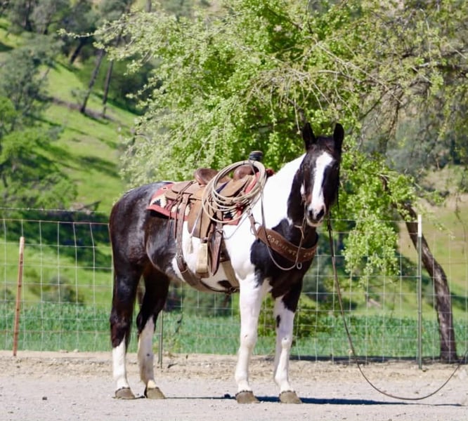 "AVAILABLE ON ONLINE HORSE AUCTION AT www DOT PlatinumEquineAuction DOT com BIDDING OPEN NOW thru SUNDAY | APRIL 5TH! *Final price will be determined on auction site* CONSIGNOR CONTACT INFO: Longhorn Ranch 831-537-1915 LOCATION: Paicines, CA BILLIE 13-Year-Old Black & White Paint Mare • 14.3 Hands Handy • Broke • and beautiful Not too big. Not too much. Not too little either. Billie lands right in that sweet spot. She’s 14.3 hands of handy, easy-to-get-along-with kind of horse — the kind you can step on without a second thought and just go enjoy your ride. But don’t mistake easy for dull… This mare will travel. Billie has a natural steady way of going that makes her a pleasure out on the trail. She’ll cover ground without being pushed, move out with purpose, and still stay right there with you. She’s not lazy, not over-the-top — just a good, honest “in-between” that makes sense. Point her out across country and she goes to work. Brush, hills, rough ground, water — she handles it without hesitation and keeps a steady rhythm the whole way. She’s the kind you can actually go get something done on… or just go somewhere and enjoy it. Around town, she’s just as solid. Traffic, noise, commotion — she takes it in stride and stays level-headed. Obstacles? Not worth mentioning. Bridges, tarps, flags — she walks through it like it’s part of the job. On the ranch, Billie knows her way around a day’s work. She’s been used to rope and brand on, is confident around cattle, and has a natural feel for her job. Sorting, gathering, or just covering ground — she’s useful without being complicated. And when you’re done… She’s easy to live with. Quiet to saddle. Stands tied. Hauls well. Gets along wherever you put her. No babysitting. No overthinking. No surprises. Just a good-feeling, good-minded mare that shows up the same every time and makes riding enjoyable. She’s the kind that doesn’t wear you out… but still gets you where you’re going. If you’re looking for a handy-sized mare that’s broke, useful, and covers country with ease — Billie is one you’ll appreciate every ride. Paicines, California Longhorn Ranch call or text Dina 831-537-1915 Nationwide shipping available