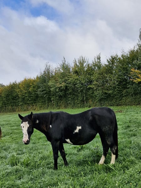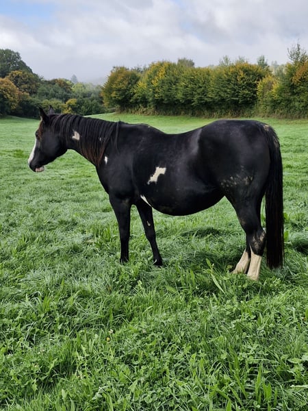 Black Overo Paint Mare, full sister of EMH TITANS STARFIRMIN, grullo tobiano, double homozygous, and in foal with her black Tovero foal.