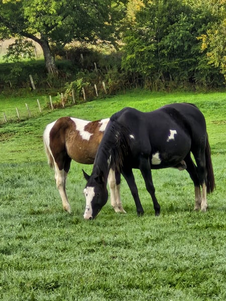 Jument paint black overo pleine de EMH TITANS STARFIRMIN paint grullo tobiano double homozygote et suitée de son poulain black tovero
