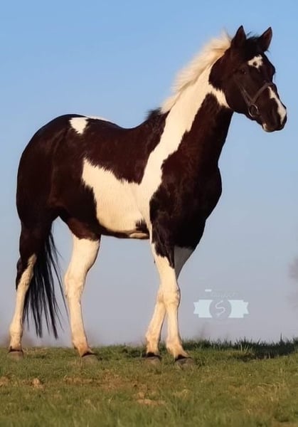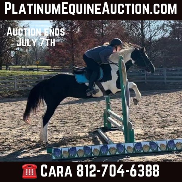 ONLINE AUCTION Place your bids at www.PlatinumEquineAuction.com Starting Bid $3500 Auction ends July 7th, 2024 Need a new saddle? Check out White Rock Saddles on our website or Facebook! Judges First Angel (Tibby) 2010 Reg. APHA 15 h Black / White Mare If I was asked to explain what a well rounded versatile horse was, I would just describe our mare Tibby. She is that great blend of nice conformation (that promotes soundness), good minded, and shines both inside and out of the arena. She has had extensive training in both western and English disciplines. Tibby has been used for many different jobs at our farm from lessons, showing, trail riding, and is ready to be someone’s ranch horse if that’s the direction they wish to go. When it comes to English riding Tibby is all class with her floaty trot and beautiful form over fences. She is currently jumping around 2’6” courses with flying or simple lead changes. She has earned several Championships and Reserve Championships at the shows with her riders. Tibby also has that Western grit to her and has a great handle. We have thrown a rope off her, and she shows lots of potential to make a great ranch horse. She does not mind tarps, pulling logs, going through gates, and has been exposed to cattle. She would be an exceptional 4H horse for the rider who likes to do it all, and is quality enough to be shown on the breed circuit as well. Tibby is not all show, she is a well seasoned trail horse and has been one of our go to trail horses for those long trips. We just recently got back from a week long trip to Eminence, MO. She really allows you to enjoy yourself while trail riding, crosses water: creeks and rivers, handles all type of steep and rough terrain with no issues, and it doesn’t matter if you like to lead the group or bring up the rear. She is not spooky or reactive and rides down the road like a pro. Tibby is sound, requires no maintenance, no vices, and is up to date on farrier, coggins, deworming, and vaccinations. She is easy to tack up, stands for all grooming, loads/ unloads easily. Tibby is a true all around horse that isn’t limited to just riding in the arena or only for trail riding. She is ready to go and the sky is the limit on what all you can do with her. For more information please call or message Cara Thomas 812-704-6388 located in Borden IN. ONLINE AUCTION Place your bids at www.PlatinumEquineAuction.com Starting Bid $3500 Auction ends July 7th, 2024 Need a new saddle? Check out White Rock Saddles on our website or Facebook!