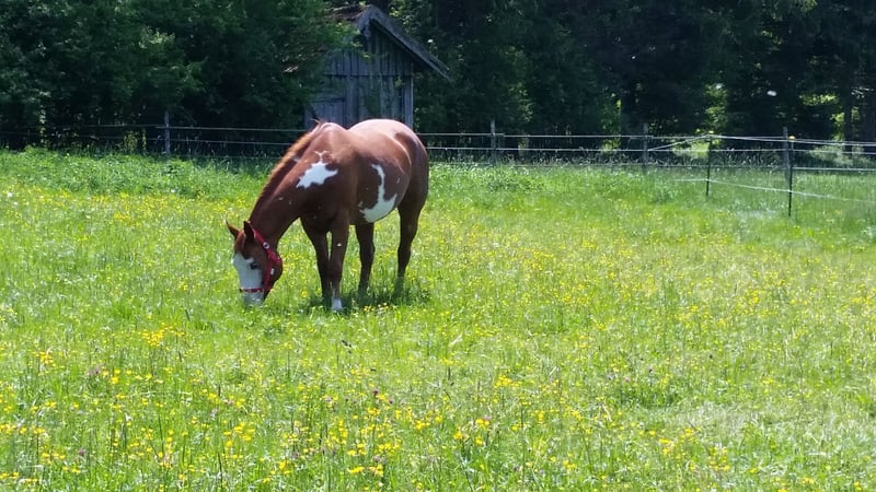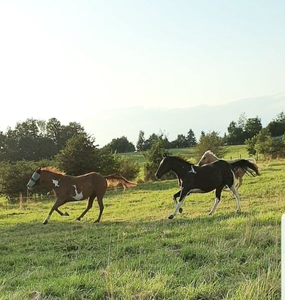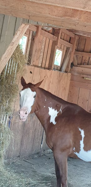 A characteristically sound and well-behaved mare suitable as a companion horse for best placement. Housed exclusively in an open stable without straw bedding due to allergies. Her front legs have had a congenital misalignment since birth, which poses no problem for a leisure rider and has been checked without any findings. This affectionate mare is especially suitable as a companion, lead horse, or for trail riding. No dusty riding halls or arenas. Perfect for forest and meadow riding. Ideal for nature-loving riders who prefer not to do ground work! She has a very good basic Western riding foundation and responds very delicately. She loves being groomed and enjoys human contact. A true soul of a horse. Please only contact me if you keep her in an open stable. Priority goes to space over price.