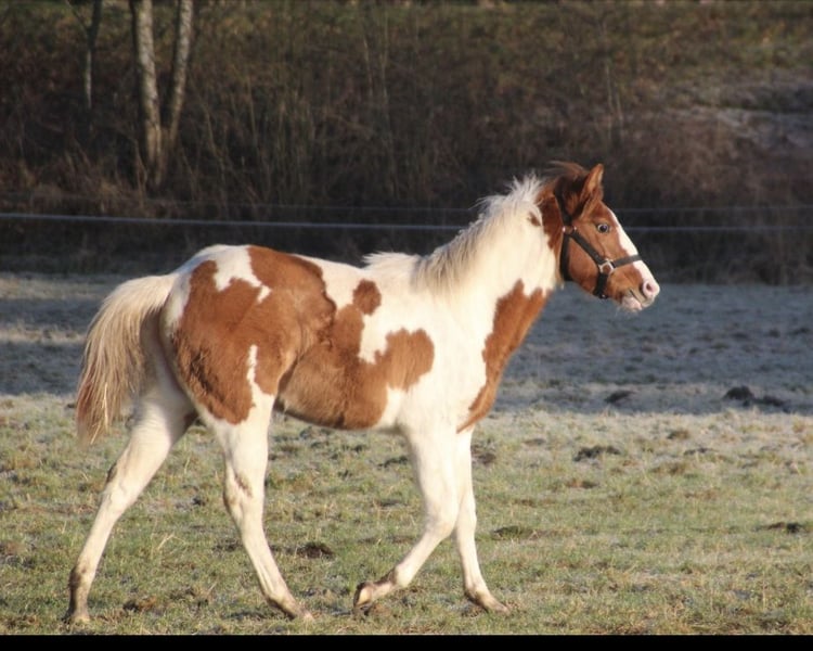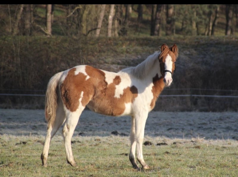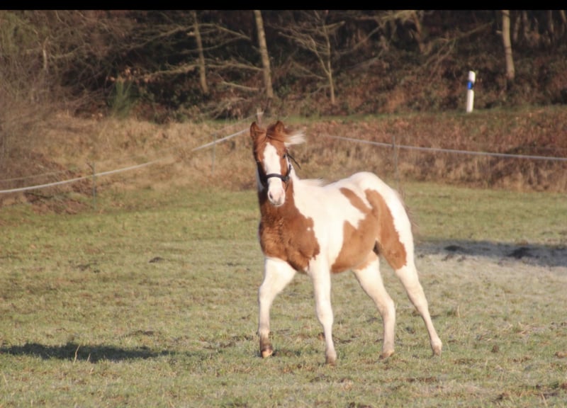 APHA Mare born April 2025 in Red Dun I am offering my little girl born in April 2025. She is very sweet and eager to learn new things, and she enjoys being pampered. The farrier and trailer loading are no problem for her, and she handles both very well. Her mother is my homozygous tobiano mare, Continental Bumblebee, standing at 150 cm. Her father is Jeannes Happy Light, measuring 153 cm, in a dunskin coat. She inherited the dun gene from him. She has papers from the APHA and a passport from the PHCG. I could also imagine Happy Bumblebee, or Hummel, as a wonderful family pony. We live in 49843. Price: €4,500 negotiable.