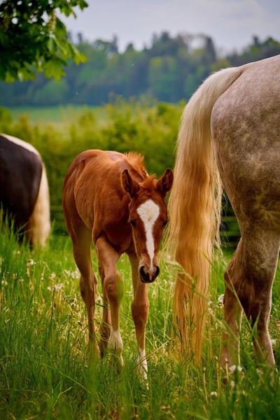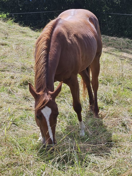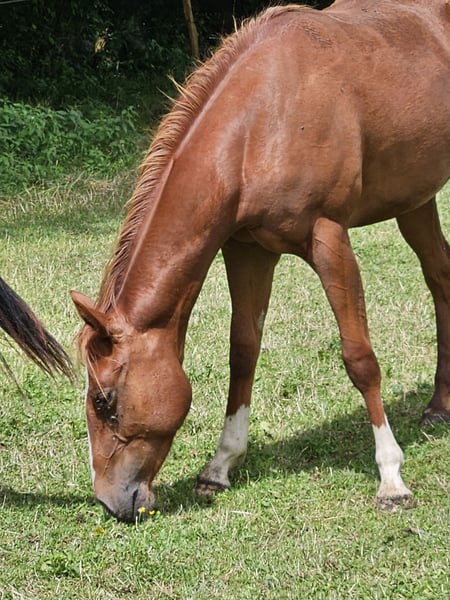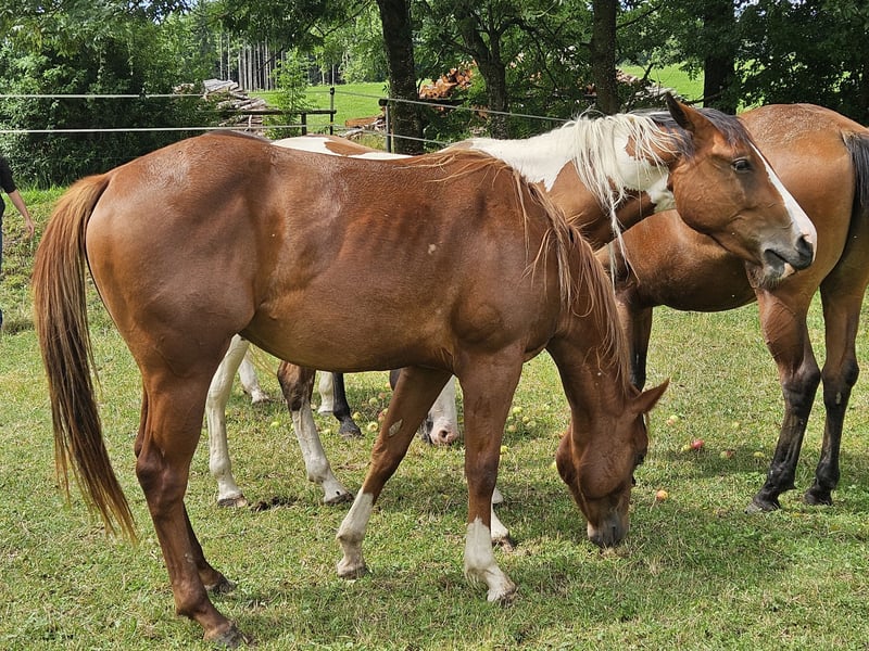 An exceptional Paint Horse mare, born in 2023, is for sale. With her fascinating chestnut coat, Velvet is a real eye-catcher and makes the hearts of all horse lovers beat faster. Our mare is not only a true beauty, but also a real cowhorse. Ideal for anyone looking for a horse to work with cattle or who simply appreciates a versatile and intelligent horse. She is well-mannered, friendly and has an even temperament. With her robust soundness and adaptability, she is suitable for a variety of equestrian sports. Her remarkable pedigree and outstanding qualities make her an ideal horse for ambitious riders and breeders alike. If you are looking for a horse with both beauty and performance, then our Paint Horse mare could be just what you are looking for. Grows up in a species-appropriate herd. Original APHA papers and equine passport About parents N/N Gladly by phone, email takes longer