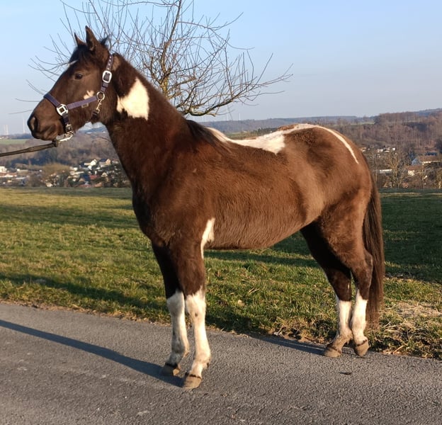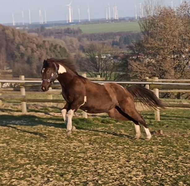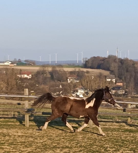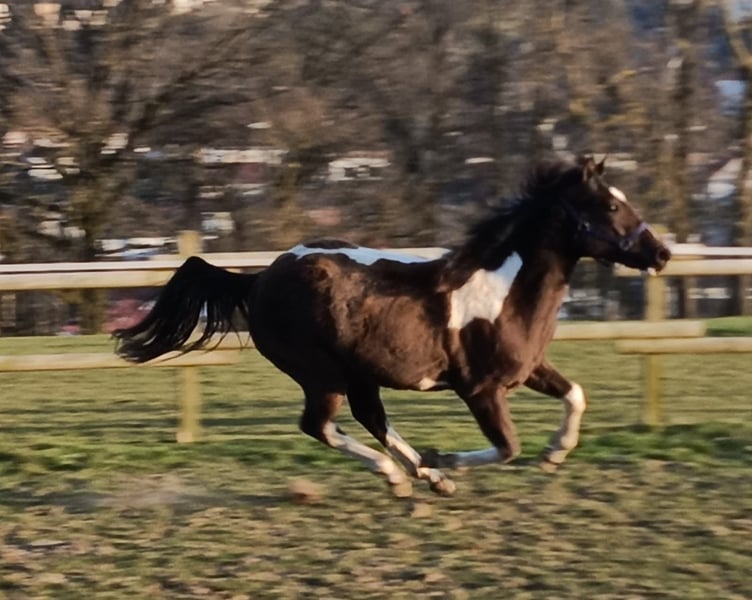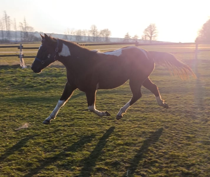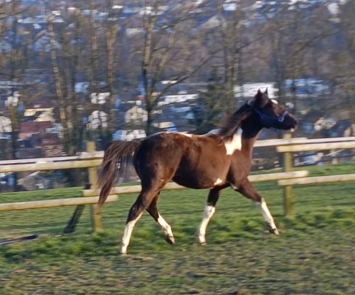 Zum Verkauf steht unsere wunderschöne Paint Horse Stute Easy Music King RS, liebevoll „Elsa“ genannt. Farbe Smoky Black Tobiano Elsa überzeugt nicht nur durch ihre tolle Zeichnung, sondern vor allem durch ihr ausgeglichenes und freundliches Wesen. Sie ist sehr lieb im Umgang, halfterführig und zeigt sich stets entspannt und menschenbezogen. In der gemischten Herde ist sie rangniedrig und absolut verträglich. Sie steht aktuell im Offenstall und ist diese Haltungsform bestens gewohnt. Regelmäßige Entwurmung ist selbstverständlich erfolgt, zudem kennt sie die Hufbearbeitung und verhält sich dabei brav. Abstammung: Vater: Rocky Mountain Music Mutter: Ivory Kingdun RS Informationen: • Rasse: Paint Horse (APHA) • Geschätztes Endmaß: ca. 155 cm (anhand der Vollgeschwister geschätzt) • 5-Panel-Test: N/N • OLWS: N/N • MHYM: N/N • APHA-Papiere vorhanden • E-Pass vom PHCG Elsa ist eine tolle, entspannte Jungstute mit bester Abstammung und einem klaren Kopf – ideal für Freizeit, weitere Ausbildung oder Zucht. Bei ernsthaftem Interesse freuen wir uns über eine Nachricht