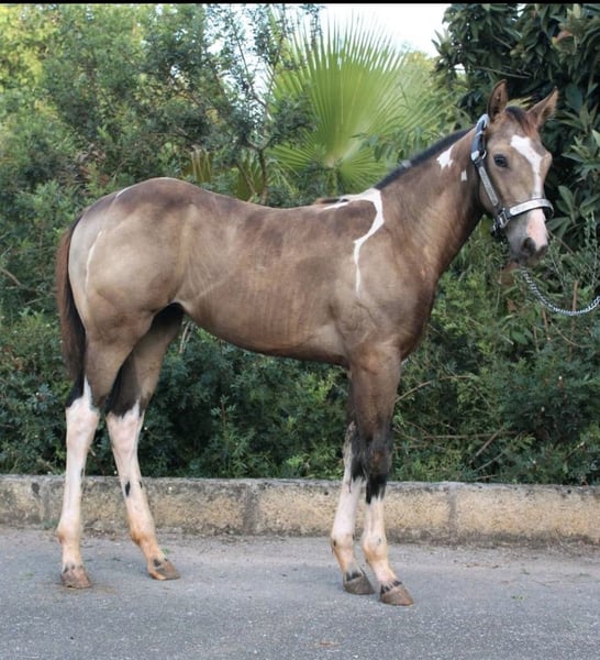 AM POCO MAGIC LUCY Lucy is a beautiful Buckskin Tobiano mare. Current height approximately 1.54 m (about 15.2 hh). Sire: Magic on ICE Dam: Betsy Poco Twist (last photo of parents) She is registered with the APHA. Lucy has been tested for her parentage with 5-panel n/n and UC Davis Imm n/n. Additionally, she carries the coat color genes E/e, A/a, Cr/n, To/n. Foundation bloodline percentage: 84%. She may also be of interest for breeding purposes. Paint Horse mare, 2.5 years old – talented, confident, in training. We are offering our 2.5-year-old Paint mare, Lucy. Lucy is unlikely to be a typical beginner’s horse but rather suited for ambitious riders who enjoy nurturing her potential. She is well-behaved and confident in handling. Lucy has already made significant progress in groundwork and accepts the saddle quite well. Currently, she is being gently prepared for further riding training at a professional training stable. She is vaccinated, chipped, regularly dewormed, familiar with the farrier, and well-socialized. Lucy is an alert, eager-to-learn young mare who, with proper guidance, can become an excellent horse for sport or dedicated leisure riders. If interested, we look forward to hearing from you.