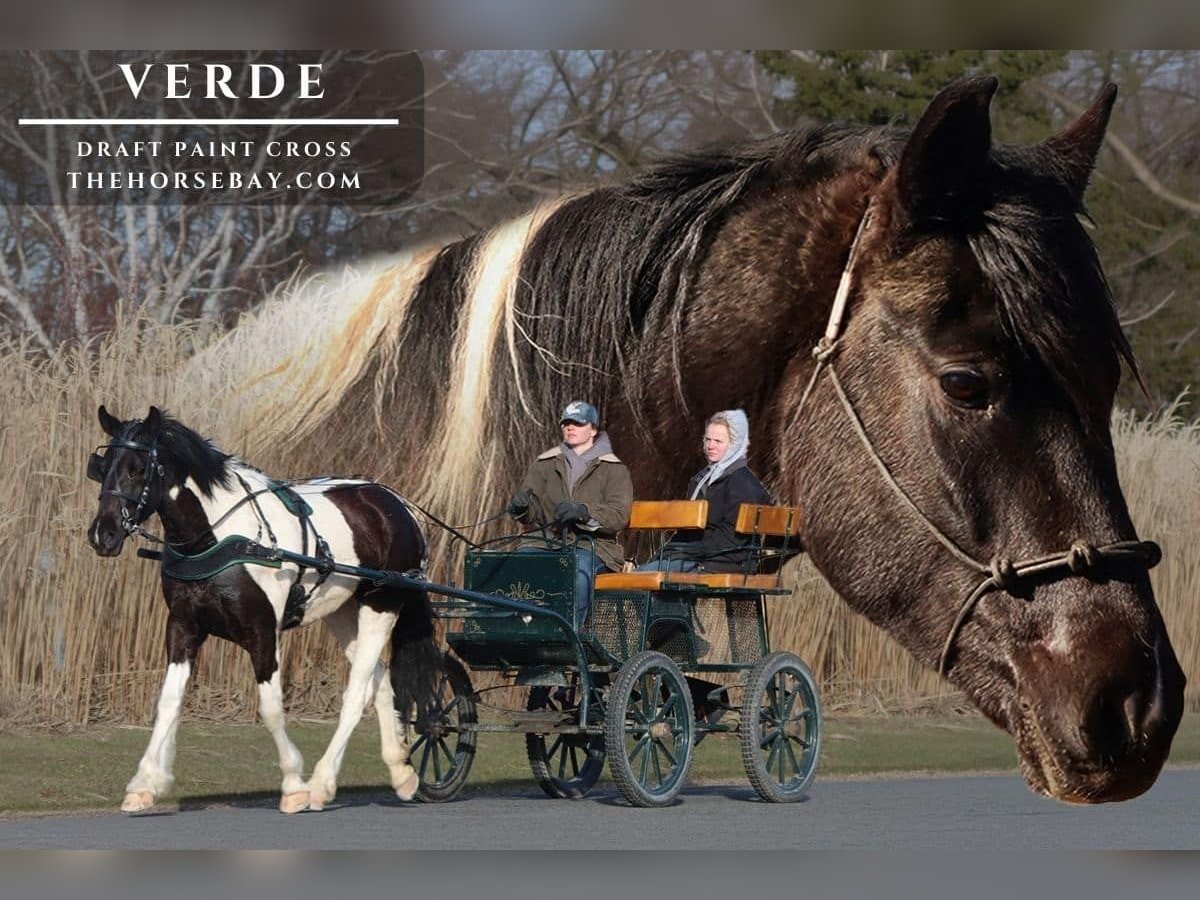 Introducing Verde, a 5-year-old Draft Paint Cross Mare standing at a solid 15 hands tall. Verde both Rides & Drives! She is safe and fun both ways. She is nice and stout to carry a bigger rider, but she is not overly drafty. For driving, Verde is good for hitching, getting on/off the cart, stop signs, and stoplights. She is fine with traffic; she has been driven past semis and heavy traffic, and she never bats an eye. She is easy to control on the lines and drives in just a snaffle bit. She knows the words walk on, trot, easy, and whoa. She automatically starts slowing down when she sees a stop sign coming up. This isn’t her first rodeo; she has loads of road experience and does NOT spook easily. She has a very solid mind. For riding, she is a blast. She’ll take her canter right off of a walk. Has a nice, smooth, easy-to-sit-to canter. And her trot is smooth as well. For being a draft, she is NOT clumsy; she has just enough draft to make her quiet, yet not too much to make her lazy. She is a good mixture. She’ll go anywhere out on the trails; she has NO fear whatsoever. She is very smart and picks up on new things quickly. She’ll go up or down a steep bank, through the creeks, rivers, and over the bridges, big or small. She will ride out alone, away from home, and ride fine in a group. She is the “in-your-pocket” type, so very personable and friendly. Loves to come greet you anytime you go out in her pasture, so she is easy to catch. And loves getting scratches and pettings, she is almost like a big dog. She loads and hauls great. Stands still for tacking and mounting. She is an easy keeper and NO maintenance required. Your farrier is going to LOVE her she stands stock still for the hot shoe treatment. She is also great at baths; she does not mind the hose. She gets along out in the herd; she is middle of the pecking order. This girl is DOWN TO EARTH, absolutely NO drama or nonsense. She has a get-her-done attitude as well as a been-there-and-done-that demeanor. And she is used to riding with a doggy sidekick named Tramp. So she is quite used to his shenanigans of running full speed up behind her and popping in and out of the brush in front and behind her. She has also had several neighbor dogs come out at her while driving, and she doesn’t blink; her eye just gets on with her job. Most of the neighbor dogs that come out either want to play or just bark at her, but there is one that comes and tries to nip her legs, and she just ignores them all. She is fine with wildlife out on the trail as well. She is great for brush popping and making new trails. She will plow through any thick brush and doesn’t mind if it gets caught up in her legs or comes up and hits her in the hind end. She will stand well for breaking branches overhead as well. And I just love how she takes the steep banks. She doesn’t refuse to go; instead, she finds a way, either climbing up a steep bank or hopping up it if needed. She has NO fear whatsoever, at least I haven’t found anything yet that bothers her. I really believe horses with that curious personality, like Verde, are just generally more willing to please and less bothered by new things that they may run into. And with her willingness to please and wanting to be your partner, she could easily go into another direction besides the driving and trails if someone wanted to take her there. And she’s young enough to do it. I could see her being a natural at fox hunting or doing some fun jumps. As she will jump over logs out on the trail with natural agility and willingness. And with Verde, there are NO unknowns; we have her entire history. So her story starts in Montana out west very romantic western themed setting I know… Anyways she gave these poor creatures (I think they are called humans) carriage rides through town. Because she’s just that sweet, she felt sorry for those lazy, poor, two-legged people. She also gave rides and was known around town by almost everyone. But then one day she decided to move eastward and see some country. And now she’s residing here in Michigan, still giving people rides both in the saddle and the carriage. And to this day, she ponders one of life’s greatest philosophical questions to all horses… And that is… Why do humans need horses to pull a carriage into town when they own a car? I don’t think she’ll ever have her answer, but she’s ready for some new adventures with her new forever human. She comes up to date on everything: vet check, coggins, shots, dewormings, and farrier. Just call with any questions or to come see her in person.