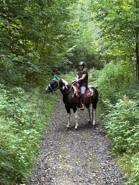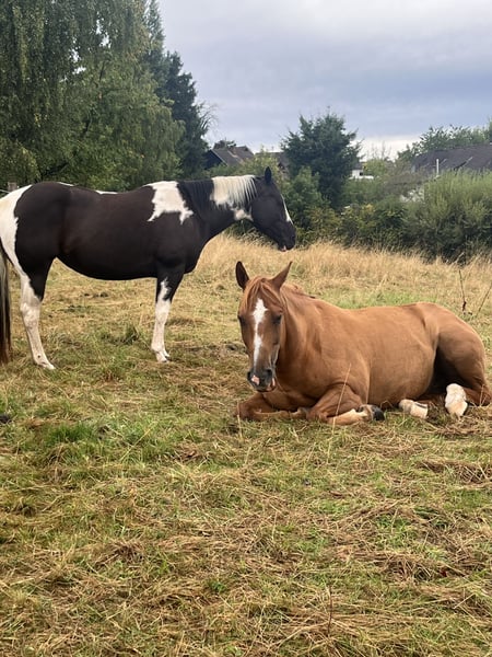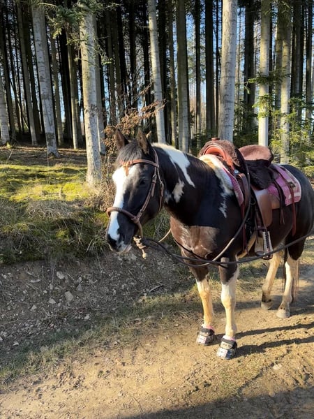 Wir suchen ein neues, passendes Zuhause für unsere American Paint Horse Stute Great Paula, geboren am 19.06.2018. • 5 Panel Test n/n • Kleine AKU liegt vor • Zähne im Dezember 2025 gemacht • Regelmäßig geimpft (Influenza/Tetanus) • Läuft barhuf, im Gelände je nach Untergrund mit Hufschuhen • Gebisslos geritten • Kennt Tierarzt, Huforthopäde, Verladen, Osteopathin Paula steht bei uns im Offenstall. Sie ist sehr robust und wurde diesen Winter nur wenige Male eingedeckt. Eine Box für die Nacht kennt sie ebenfalls. Letztes Jahr war sie für drei Monate im Beritt. Sie geht sehr gerne ins Gelände, mag die Bodenarbeit, auch mit Stangen und Schrecktraining, da ist sie neugierig und aufmerksam. Wir nehmen Unterricht in der Halle, das ist für sie auch kein Problem. Mit anderen Pferden ist Paula sehr sozial und eher rangniedrig. Wir können sie uns gut in einer größeren Herde vorstellen. In unserer kleinen Konstellation mit nur einem Wallach rosst sie recht stark. Bei der Vorbesitzerin hatte sie bereits ein gesundes Fohlen. Wenn sie alleine bleiben soll, wird sie eher unruhig. Als im letzten Sommer eine weitere Stute bei uns stand, war Paula deutlich entspannter. Generell profitiert sie von regelmäßiger Arbeit und lernt schnell. m Umgang ist sie freundlich und verschmust. Kinder können sie problemlos putzen, einflechten, führen und mit ihr am Boden arbeiten. Reiterlich darf Paula noch weiter gefördert werden, wir können sie uns auch gut als Wanderreitpferd vorstellen, da sie gerne querfeldein, durch Wasser, über Baumstämme und verschiedenes Gelände geht. Bei uns bekommt sie 24/7 Heu und im Sommer rund um die Uhr Weide, was sie super verträgt. Ein für sie angepasster Deuber Sattel kann mit gekauft werden. Bei Interesse freuen wir uns über eine kurze Nachricht mit ein paar Informationen zum zukünftigen Zuhause, wir melden uns dann zurück!