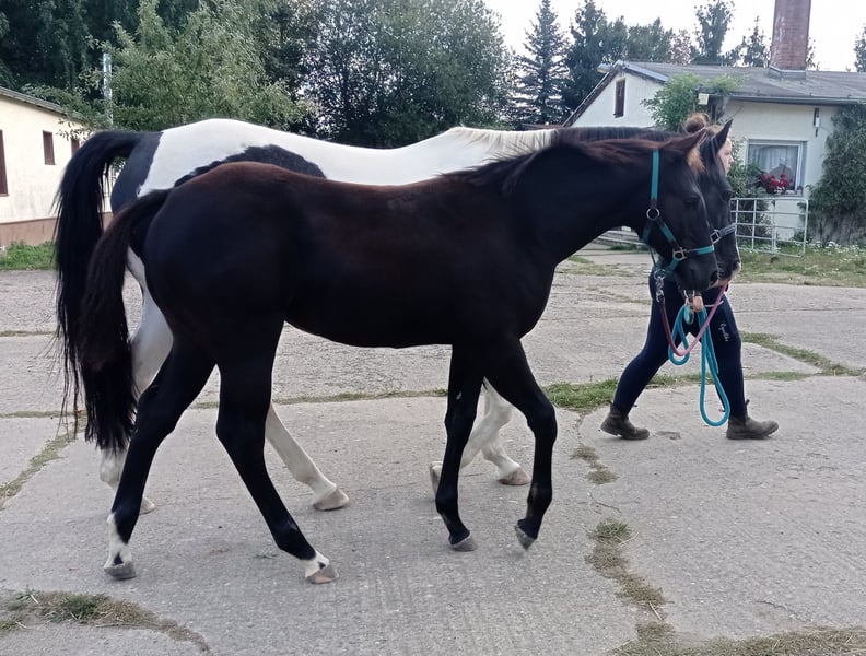 Hi, ich bin die kleine Sikari (indianisch= Süße) und bin ein charakterstarkes Black solid Stutfohlen. Geboren wurde ich im Mai 2025 und suche nach dem Absetzen im Dezember einen liebevollen und konsequenten Besitzer. Mein Papa ist Black Starbuck , ein 154 cm großer Quarter Hengst mit allerbester Abstammung (Hollywood Dun It, Colonels Smoking Gun, Katie Gun ...) Meine Mama ist Special Velvet Mount, Prämienstute (1,46). Meine Mama ist 6Panel n/n. Ich bin vom ersten Tag an ein richtiger Schelm, der ganz viel kuscheln und alles entdecken will. Wenn ich groß bin, werde ich so etwa ein Endmaß von ca. 1,50 m bekommen. Schon jetzt bin ich ein sehr kräftiges und muskulöses Fohli. Mutig setze ich mich mit allem Neuen auseinander und weiß auch recht genau, was ich will. Das habe ich von meiner Mami :) Ich wachse in einer gemischten Herde in einer Paddocktrail-Haltung auf. So kann ich ganz viel laufen, spielen und futtern, wie ich will. Ich wünsche mir, dass das auch bei meinem neuen Besitzer so bleibt. In eine Box möchte ich nicht, auch nicht nachts. Bis zum Absetzen wird Sikari regelmäßig entwurmt, dem Schmied vorgestellt und lernt das Fohlen ABC. Wir legen sehr großen Wert darauf, dass unsere Fohlen gut erzogen und freundlich sind. Sikari bekommt außerdem einen Equidenpass vom PHCG und APHA Papiere. Wenn Sikari Ihr Interesse geweckt hat, schreiben Sie uns gerne für mehr Infos an. Unsere Fohlen werden nur in artgerechte Haltung (Offenstall/Aktivstall/Paddock Trail u.Ä.) und liebevolle Hände vermittelt, die auch bereit sind, ihrem kleinen Schatz ein Aufwachsen und Leben mit freiem Auslauf zu bieten. Da unsere Fohlen mitentscheiden dürfen, wer ihr Partner wird, ist ein vorheriges Kennenlernen unabdingbar. Der Preis gilt bis April 2026. www.harzhof-minsleben.de