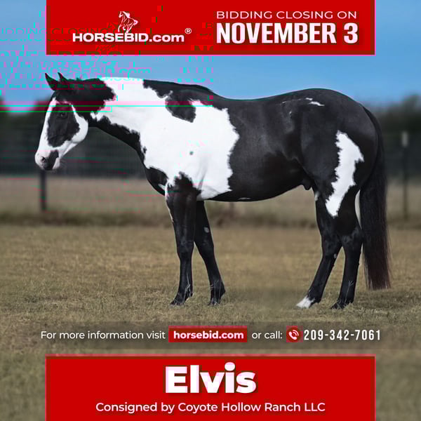 ⚜️𝐓𝐇𝐄 𝐅𝐀𝐋𝐋 𝐇𝐄𝐑𝐈𝐓𝐀𝐆𝐄 𝐂𝐋𝐀𝐒𝐒𝐈𝐂⚜️ Happening now thru MONDAY | NOVEMBER 3rd - Available EXCLUSIVELY on HorseBid's website! For more details and to register visit: www.Horsebid.com CONSIGNOR CONTACT: Coyote Hollow Ranch LLC 209-342-7061 LOCATION: Mount Vernon, TX BREED: Paint REGISTERED: No COLOR: Black and white HEIGHT: 15 AGE: 9 GENDER: Gelding 🔥 Elvis – The Kind of Horse Everyone Falls in Love With** 🔥 Meet Elvis, a one-of-a-kind paint gelding with color and markings that turn heads everywhere he goes. He’s just as gentle as he is striking — the kind you can trust to take care of the whole family. Elvis has been used extensively outside and knows what a day’s work is. He’s been used to doctor sick yearlings, check cattle, and handle any ranch task with a calm, steady mind. Out on the trail, he’s absolutely solid — crosses water, rough terrain, bridges, and anything else you point him at without hesitation. He’s kid safe, family approved, and the same horse every single day. Elvis stands quiet for the farrier, bathes and clips with ease, and loads and hauls like a pro. Whether you’re looking for a dependable partner for ranch work, a safe mount for your kids, or a beautiful gelding to enjoy on the weekends, Elvis checks every box. ✅ Gentle for anyone ✅ Ranch and trail proven ✅ Easy to shoe, bathe, and load 💥 Safe. Broke. Beautiful. That’s Elvis. 💥