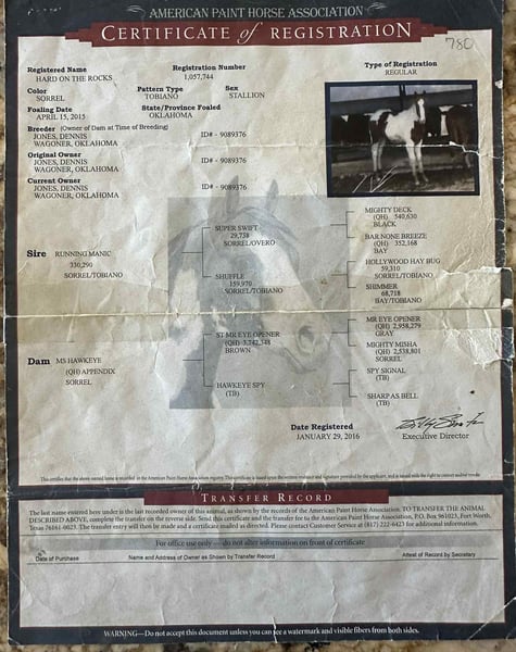 ONLINE AUCTION Place your bids at www.PlatinumEquineAuction.com Starting Bid $3500 Auction ends August 3rd, 2025 Need a new saddle? Check out White Rock Saddles on our website or Facebook Hard On The Rocks aka Rip is a Beautiful, Seasoned Sorrel Tobiano Paint, that is a 2015 model, reg APHA, gelding that is standing 15.1hh. Rip is a handsome paint gelding with all the experience and heart you could ask for. Rip has been used extensively on the ranch and trails. He’s gathered cattle in big mountain country, crossed rivers, navigated rocky terrain, and he’s no stranger to a long day’s work. He’s also been ridden through town — traffic-safe, calm, and steady no matter the situation. One of Rip’s best qualities? He’s easy to leave off and easy to bring back. Whether it’s been a week or a month, he saddles up quiet and rides off like a gentleman. He’s smooth, easy to ride, and gets along well with other horses in the pasture or on the trail. While he’s good for anyone, Rip does seem to have a soft spot for the ladies — he’s happiest with a kind, quiet rider. If you want a horse that’s been there, done that, and still has plenty of good years ahead of him, Rip is your guy. He is located in Nogales, AZ. Contact Kyle with Thunder Valley Ranch 402-910-6476 with any questions. Shipping is available anywhere in the US. ONLINE AUCTION Place your bids at www.PlatinumEquineAuction.com Starting Bid $3500 Auction ends August 3rd, 2025 Need a new saddle? Check out White Rock Saddles on our website or Facebook