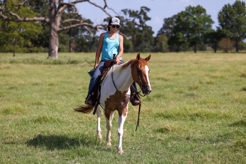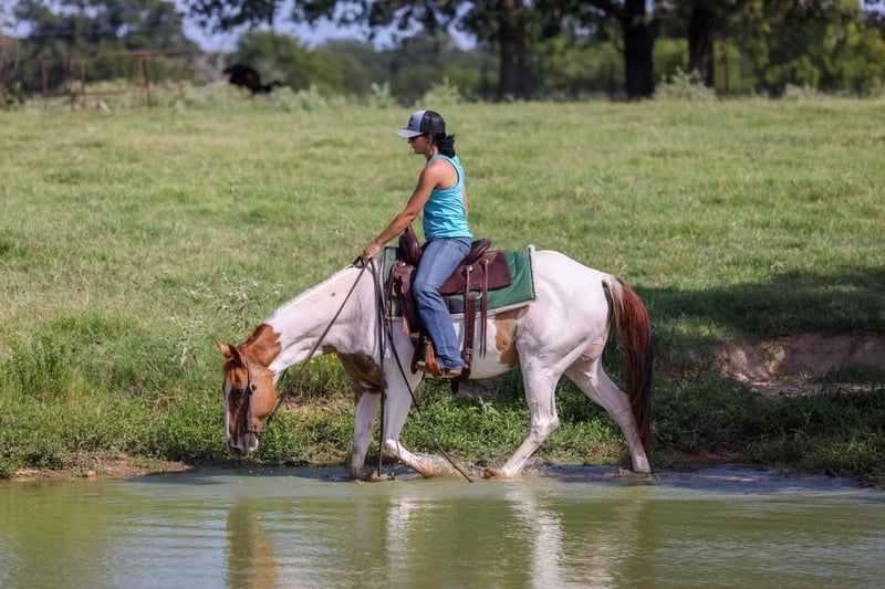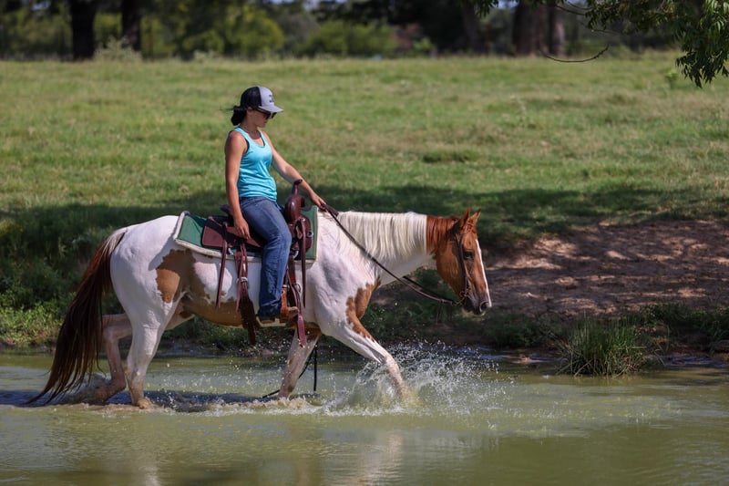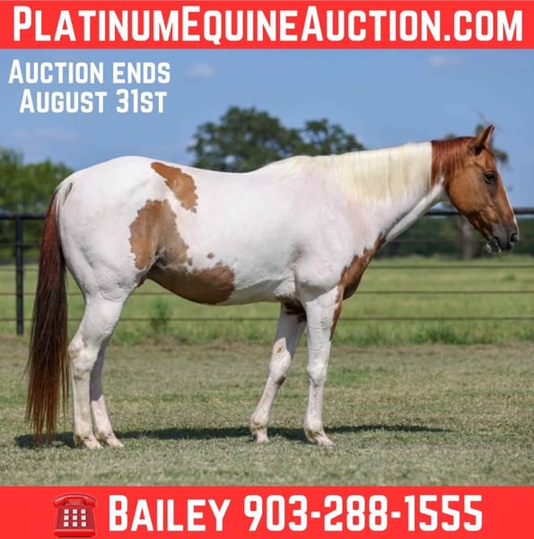 ONLINE AUCTION Place your bids at www.PlatinumEquineAuction.com Starting Bid $3500 Auction ends August 31st, 2025 Need a new saddle? Check out White Rock Saddles on our website or Facebook Meet SCOOBY! He is a 14.3hh, 10-Year-Old Chestnut Tobiano Paint Gelding. This handsome gelding is the total package – safe, gentle, and easy on the eyes. Standing at 14.3 hands, he’s the perfect size for both adults and youth. At 10 years old, he has the experience and steady mind to make every ride enjoyable. He’s extremely gentle and dependable, making him suitable for riders of all levels – from beginners wanting a trustworthy partner to experienced riders looking for a fun, uncomplicated horse. He rides quiet and consistent, with a smooth way of going and a willing attitude. Not only is he safe, he’s also a real looker – a beautifully marked paint with a kind eye and classy build that always gets attention. Whether you’re riding down the trail, in the arena, or just enjoying his company in the pasture, this gelding is as easy-going as they come. If you’re looking for a pretty, people-friendly gelding that anyone can ride, this one checks all the boxes! Located in Canton, TX. Contact Bailey at Slaton Saddlery 903-288-1555 with any questions. ONLINE AUCTION Place your bids at www.PlatinumEquineAuction.com Starting Bid $3500 Auction ends August 31st, 2025 Need a new saddle? Check out White Rock Saddles on our website or Facebook