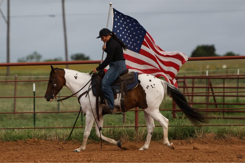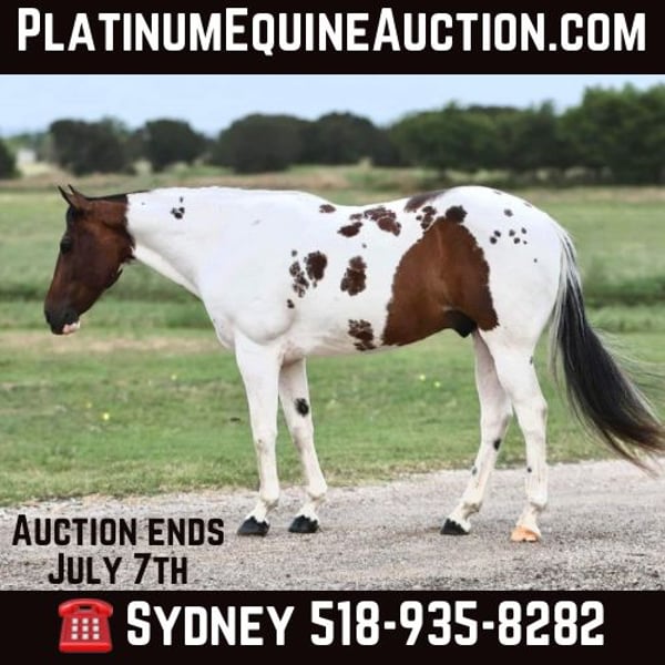ONLINE AUCTION Place your bids at www.PlatinumEquineAuction.com Starting Bid $3500 Auction ends July 7th, 2024 Need a new saddle? Check out White Rock Saddles on our website or Facebook! Bandit is an 9 year old Grade Paint gelding that stands at 14.1 hands. Bandit will steal your heart with his amazing personality and calm disposition. He is gentle and kind with an adorable puppy dog personality. He comes running to you from the far end of the pasture just for some love, no treats needed to catch this guy! Bandit is a gentleman on the ground and in the saddle. He has a very smooth trot and lope that’s easy to sit. He will neck rein or direct rein. He is happy to collect and move a little slower or extend his gaits and cover some ground. Bandit does well being ridden by himself or with other horses. He has been ridden around cattle, gone on long distance trail rides, and gone to some play days. He will make an excellent all around horse that will quite literally go all day long. He is very consistent and does well with time off. Bandit stands stands tied nicely to be groomed, saddled, and bathed. He has been seen by our vet, farrier, dentist, and chiropractor recently and was an outstanding citizen for all. He loads on and off the trailer nicely. New sights do not bother him and he’s able to think through scary situations quite well. He has no vices that I’ve come across, does well in and stall or outside and is happy to be by himself or with other horses. Bandits personality makes him so fun to be around, he loves to be loved on and will always be happy to be with you. For more information and any questions you may have about Bandit, please call Sydney with SRS Training and Sales 518-935-8282. Bandit is located in Granbury, TX. ONLINE AUCTION Place your bids at www.PlatinumEquineAuction.com Starting Bid $3500 Auction ends July 7th, 2024 Need a new saddle? Check out White Rock Saddles on our website or Facebook!