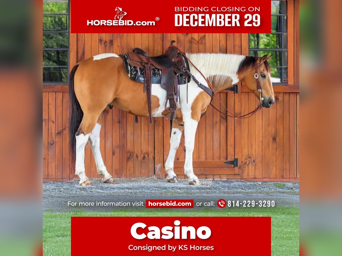 ⚜️ 𝓗𝓮𝓻𝓲𝓽𝓪𝓰𝓮 𝐖𝐢𝐧𝐭𝐞𝐫 𝓒𝓵𝓪𝓼𝓼𝓲𝓬⚜️ Happening now thru MONDAY | DECEMBER 29th - Available EXCLUSIVELY on HorseBid's website! For more details and to register visit: www.Horsebid.com CONSIGNOR CONTACT: KS Horses 814-229-3290 LOCATION: Clarion, PA BREED: Paint REGISTERED: Yes REGISTERED NAME: Casinos Treasure COLOR: Buckskin and White HEIGHT: 15.1 AGE: 11 GENDER: Gelding Casino is a Registered 11 Year Old Buckskin and White Paint Gelding. He stands 15.1 hands tall. Casino is as Pretty As They Come! Not only is he pretty but he has the ride to go with his good looks. He is very good broke and most importantly very quiet and gentle and safe! He is one of the best trail horses I have rode. Watch his video and you will see him crossing the Clarion River in the high water. He goes wherever you point him to go on the trail and never refuses or hesitates. Very reliable and seasoned and sure footed on the trail and in the rough terrain. He is also very well broke in the arena and has a nice head set, good trot, and nice lope. One hand neck rein, rides bridle less. Casino has also worked on a ranch and carries there brand on his hip. He can do any job on the ranch from checking miles of fence, to roping and doctoring cattle , to putting the beginner guest on to take out riding. My 7 year old son can ride him all over by him self. He loves his neck rein makes it very easy for him to steer. Casino is the jack of all trades and can go in any direction but most importantly safe, reliable and the same horse every day you ride him. Feel free to call or text Kris at 814-229-. 3290. We can help arrange delivery anywhere.