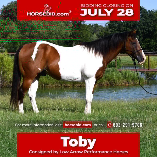 ⚔️ The HORSEMAN's Select ⚔️ Happening now thru MONDAY | JULY 28th - Available EXCLUSIVELY on HorseBid's website! For more details and to register visit: www.Horsebid.com CONSIGNOR CONTACT: Low Arrow Performance Horses 602-291-9706 LOCATION: Stephenville, TX BREED: Paint REGISTERED: No COLOR: Paint HEIGHT: 15.1 AGE: 13 GENDER: Gelding Toby is the kind of gelding everyone’s looking for but few ever find. At 13 years old and standing a stout 15.1 hands, he’s got the size, build, and temperament to be your next forever horse. He’s easy on the eyes with his flashy paint coloring, and he rides just as good as he looks. Toby has been there and done that. He’s solid on the trail—leads, follows, goes out alone or in a group, crosses water, and handles traffic, dogs, bikes, and just about anything else you throw at him. He’s been used in parades and around town, always staying cool and collected no matter what’s going on around him. He also rides well in the arena with an easy walk, trot, and lope. He is very smooth and comfortable to ride! Neck reins, moves off your leg, and is happy to pack around a beginner or step up for a more experienced rider. He’s a confidence booster for kids, guests, or anyone who just wants to feel safe in the saddle. Toby is an easy keeper, good for the farrier, loads and hauls without a fuss, and stands tied like a gentleman. He’s got a great brain, kind eyes, and a heart of gold. Whether you want a trail partner, family mount, or all-around good guy to enjoy—Toby is ready to go to work and love his people. Horses like him don’t come around often. Don’t miss the chance to make him yours. We can help lineup transportation anywhere needed. Don't hesitate to call and reach out and see if he will fit your needs!