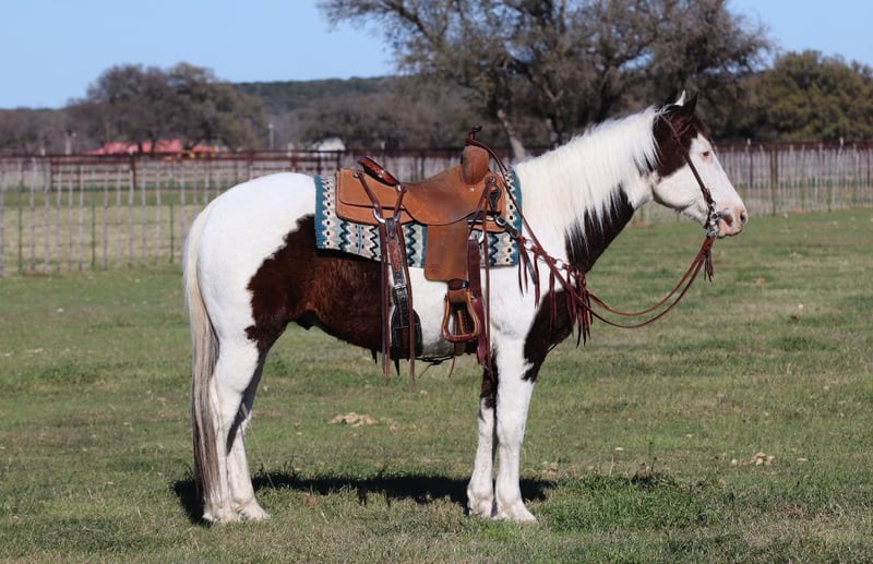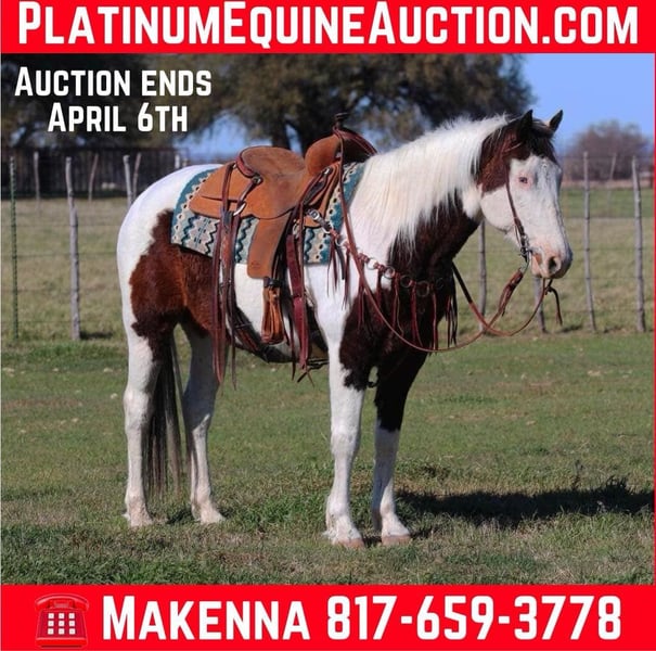 ONLINE AUCTION Place your bids at www.PlatinumEquineAuction.com Starting Bid $3500 Auction ends April 6th, 2025 Need a new saddle? Check out White Rock Saddles on our website or Facebook! Crumpet has a heart of gold and is as quiet one could hope to find. Crumpy always wants to be your best friend, and is sucker for love and attention. He is a grade 12 year old gelding standing at 14.3hh tall. Crumpet is quiet to be around, good with his feet, and a gentleman on the ground. He’s been exposed to almost anything you can imagine including guns, whips, tarps, flags, ropes, or whatever else might look strange to a horse. He wants to ride slow, and relaxed. He picks up both leads nicely and lopes off with ease. Above all Crumpet really shines, and excels being out on the trails and in the arena. He’s calm, steady, and quiet handling himself in rough country, maneuvering with ease over bridges, bogs, crossing water, etc… Crump has been ridden by all levels of riders, and is forgiving of mistakes made by those who are new, helping to build their confidence. He would really go far in trail versatility classes or would help you to capture the eyes emotions carrying a flag. Whether you’re on the ranch, and in the arena, everyone notices him by his looks, and quiet demeanor. Crumpet is a seasoned heel horse and would be great for someone to learn on! Crumpet is located in Lipan, TX. We are more than willing to help with all shipping needs, we ship all over the country as well as Hawaii and Canada. For more information please call Makenna Hartzell 817-659-3778 ONLINE AUCTION Place your bids at www.PlatinumEquineAuction.com Starting Bid $3500 Auction ends April 6th, 2025 Need a new saddle? Check out White Rock Saddles on our website or Facebook!