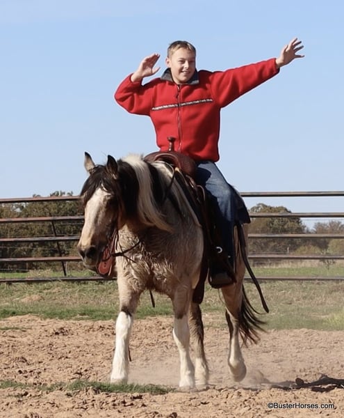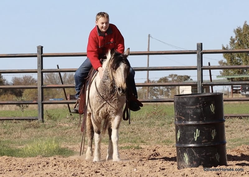 ONLINE AUCTION Place your bids at www.PlatinumEquineAuction.com Starting Bid $3500 Auction ends December 22nd, 2024 Need a new saddle? Check out White Rock Saddles on our website or Facebook! “Teddy Bear” – 13.2H, 12 year old buckskin paint gelding… If you are looking for a sweet, friendly, pleasant little horse who is always there at the gate and ready to go – then check out Teddy’s video! This little horse has been miles and miles in big country, he has checked tons of fences and cows, and he is so pleasant and easy to ride. He has a big walk and can easily keep up with any of the big horses. He will walk out on a big loose rein and travel and get you where you need to go. He is very simple and uncomplicated to ride, he guides well and has a good stop anytime you mention whoa! He has done a little jumping and would make the cutest little entry level dressage or nunter / jumper horse for a little lady, or for a youth rider. Teddy has very smooth gaits – he has an easy little trot and nice comfy lope. He catches both of his leads easily. If you are looking for a fun sized little horse who is big boned and stout enough to tote everyone, but small enough for anyone to ride comfortably and not be intimidated, check out this sweet affectionate little horse. Please call anytime for more information at 214-605-7174 Teddy Bear is located in Weatherford, TX – one hour from Dallas / Fort Worth International Airport. He is an easy day trip or fun overnight trip to come try out, from anywhere! We are experienced knowledgeable sellers and we can help with quickly arranging affordable shipping to any buyer’s location – we have experience shipping horses worldwide – including regularly to Hawaii, Canada, Mexico, Europe, and South Africa. Go to our Facebook page Buster Ranch and check our website for buyer reviews, for more videos, additional info, etc: ONLINE AUCTION Place your bids at www.PlatinumEquineAuction.com Starting Bid $3500 Auction ends December 22nd, 2024 Need a new saddle? Check out White Rock Saddles on our website or Facebook!