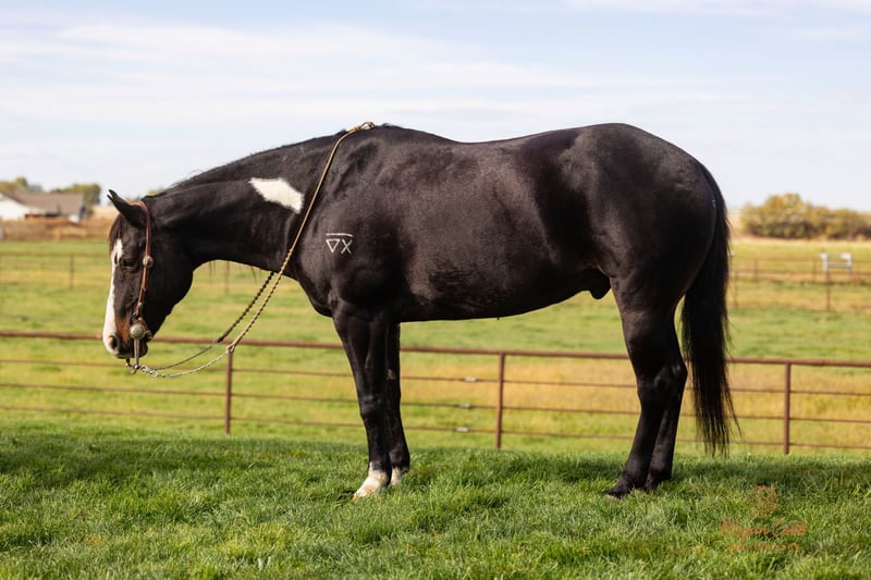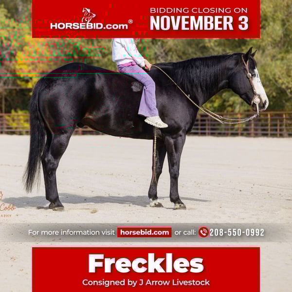 ⚜️𝐓𝐇𝐄 𝐅𝐀𝐋𝐋 𝐇𝐄𝐑𝐈𝐓𝐀𝐆𝐄 𝐂𝐋𝐀𝐒𝐒𝐈𝐂⚜️ Happening now thru MONDAY | NOVEMBER 3rd - Available EXCLUSIVELY on HorseBid's website! For more details and to register visit: www.Horsebid.com CONSIGNOR CONTACT: J Arrow Livestock 208-550-0992 LOCATION: Caldwell idaho BREED: Apha REGISTERED: Yes REGISTERED NAME: Freckles COLOR: Black and white HEIGHT: 14.1 AGE: 13 GENDER: Gelding Freckles is a super sweet ride. He’s been used outside on big ranches his whole life and has also been used in the arena. Freckles walks out good on the trails and is comfortable to ride all day. He’s low headed and will cross water and has been in rough terrain. Freckles has been roped on outside, in the branding pen as well as in the arena too breakaway and heal on. He likes people and is very friendly and well mannered. Freckles has a good neck rein and goes where he’s pointed. He knows his leads and will lope nice slow circles. Freckles has been ridden by kids a lot. You can grab him fresh out of the pasture and swing on bareback and he’s good to go. Nice little family horse that will suit your family for many years call fmi 208-550-0992.