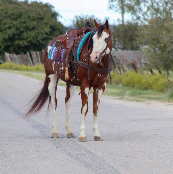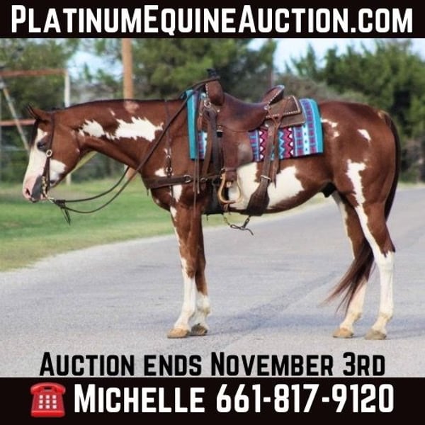ONLINE AUCTION Place your bids at www.PlatinumEquineAuction.com Starting Bid $3500 Auction ends November 3rd, 2024 Need a new saddle? Check out White Rock Saddles on our website or Facebook! If you’re looking for one that is SAFE for the whole family , seasoned , tried and true then “Flash Gordon “ is the guy for you . He is a 12 year old GORGEOUS one of a kind paint gelding standing 15.2 hds tall . Flash Gordon has two baby blue eyes that are SO pretty. This guy is absolutely uniquely marked and stands out wherever you take him . He checks all the boxes and will be safe for everyone from ages 4 to 85 . He is a true kids horse and absolutely loves kids . Flash has dabbled in a little bit of everything . He has been shown at 4H shows , and open ranch riding shows and also been used in a lesson program. Flash is an absolute blast to take down the trail and really enjoys going down the trail and seeing lots of miles . Ride him in town, in heavy traffic, crowds of people. Out on the trails he will cross logs , water , brush and goes wherever you point him . He’s got a smooth rocking chair lope to him and will lope right out of your hand like butter. He has a smooth little western pleasure jog to him and always low headed. Flash will also go english and has even been taken over small cross rails by the kids. He is truly a ONE of a kind gelding that everyone searches high and low for. Flash Gordon will not disappoint. He’s ready for his new family to enjoy. Flash is UTD on dental, vaccines, and just got a fresh set of shoes put on. Contact us to come try him, or we can set up a FaceTime also . If you need help with transport don’t hesitate to ask we have a list of reputable haulers that can get him safely to your doorstep world wide. Located in Stephenville, TX. Contact M$ Performance Horses Michelle 661-817-9120. ONLINE AUCTION Place your bids at www.PlatinumEquineAuction.com Starting Bid $3500 Auction ends November 3rd, 2024 Need a new saddle? Check out White Rock Saddles on our website or Facebook!