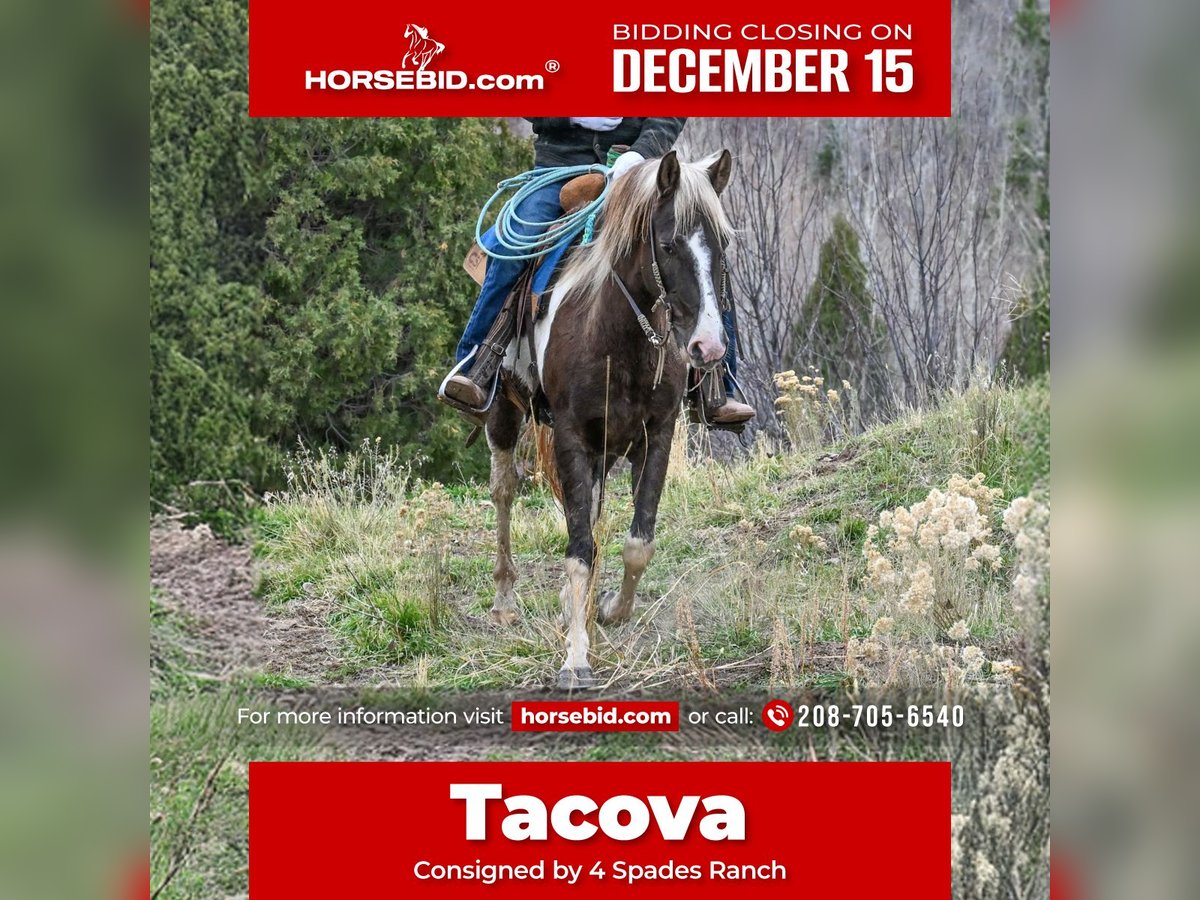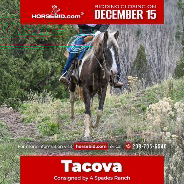 🎄𝐓𝐇𝐄 𝑯𝒐𝒍𝒊𝒅𝒂𝒚 𝐂𝐋𝐀𝐒𝐒𝐈𝐂🎄 Happening now thru MONDAY | DECEMBER 15th - Available EXCLUSIVELY on HorseBid's website! For more details and to register visit: www.Horsebid.com CONSIGNOR CONTACT: 4 Spades Ranch 208-705-6540 LOCATION: Rigby, ID BREED: Paint REGISTERED: No COLOR: Chocolate Paint HEIGHT: 14.2 AGE: 4 GENDER: Gelding Tacova is a nice, 4-year-old grade gelding standing 14.2 hands tall. He’s been used for trail riding, penning, and sorting cattle on the ranch, and he’ll ride out just as confidently alone as he does in a group. Friendly and easy to catch, Tacova has a kind eye and a willing nature. He’s started on the heel-o-matic and showing a lot of promise in the rope pen. He knows his leads, side passes, ties, loads, and stands quietly. Sound, sensible, and a pleaser — Tacova is a young gelding ready for his next adventure, whether that’s putting in miles on the ranch, heading down the trail, or finishing him your way.