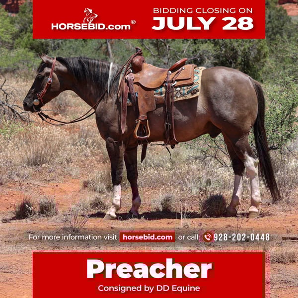 ⚔️ The HORSEMAN's Select ⚔️ Happening now thru MONDAY | JULY 28th - Available EXCLUSIVELY on HorseBid's website! For more details and to register visit: www.Horsebid.com CONSIGNOR CONTACT: DD Equine 928-202-0448 LOCATION: Camp Verde, AZ BREED: American Paint REGISTERED: Yes REGISTERED NAME: Shadows Preacher COLOR: Grulla paint HEIGHT: 15 AGE: 5 GENDER: Gelding “ Shadows Preacher “ known as Preacher is a registered APHA 5 year old! If your looking for an outstanding bred gelding that has the looks, the brain and a kind demeanor Preacher is the horse you have been looking for! Preacher has been ridden all over the rough country of Arizona, he is sure footed, walks out on a loose rein and has no spook. If you’re looking for a confidence builder that stays quiet and calm out on the trail you can’t go wrong with Preacher. We have had all level of riders on him and he just follows along while in a group, ride him out alone or in a big group and Preacher will stay the same level headed guy he is! Preacher has a puppy dog personality and really enjoys being around people. We have never had Preacher get fresh or sour. He currently is stalled but does play well with others in pasture, he is an easy keeper and is 100% sound. He loves to be groomed, he is great for the farrier, loads in a trailer easy and is quiet while tacking up. Preacher has a fancy, slow lope, if you’re older and need a smooth ride Preacher is your guy! He has a nice jog, trot and lope, he neck reins, side passes, has a big and soft stop, and has a nice turn around! He catches both leads, you can ride him two handed or one! He has smooth roll backs and is a joy to ride and play around with in the arena! Preacher has been roped off of a handful of times outside on the ranch and started in the arena! He is cowy and would make a phenomenal rodeo prospect! Preacher is bred to be in the show pen and it wouldn’t take long to get him there! He has all the training!!! Preacher also wouldn’t mind being a family horse and riding out on the ranch or in town! He can care less about busy traffic, barking dogs or bags. He is a super fun and an out going horse! Give him a ball to play with and he will keep busy all day! If you have any questions about Preacher don’t hesitate to call or text! Preacher comes with a full clean lameness exam, health and coggins.