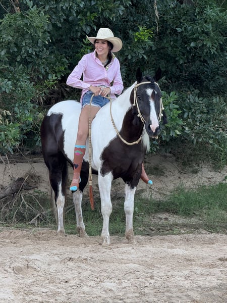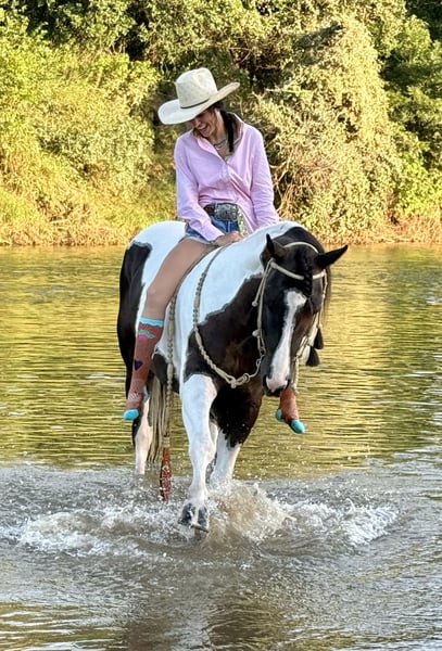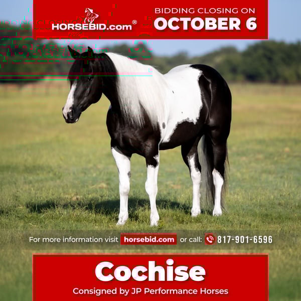 🍂 𝓐𝓾𝓽𝓾𝓶𝓷 𝑨𝑳𝑳 𝑺𝑻𝑨𝑹 𝑳𝑰𝑵𝑬𝑼𝑷 🍂 Happening now thru MONDAY | OCTOBER 6th - Available EXCLUSIVELY on HorseBid's website! For more details and to register visit: www.Horsebid.com CONSIGNOR CONTACT: JP Performance Horses 817-9016596 LOCATION: Weatherford, TX BREED: Paint REGISTERED: No COLOR: Black and white HEIGHT: 14.2 AGE: 6 GENDER: Gelding Cochise is a true black and white gelding standing 14.2 hands and absolutely the sweetest horse in our barn. His striking looks will turn heads wherever you take him. But he’s not just a pretty face— at the young age of 6, Cochise is the total package when it comes to rideability, versatility, and personality. We have used him for photo shoots with name brand companies to letting beginner camera crew ride him for podcast. He truly is one of those horses you can throw anyone on and trust he will take care of them. He is super broke to ride and gentle every single day. Whether you're saddling him up for arena work or heading out on the trail, he’s always consistent and reliable. Cochise catches both leads with ease, has a smooth lope, a solid stop, and an incredibly comfortable slow jog. He moves off leg pressure, has a clean one-handed turnaround, and an overall soft feel. Cochise has been ridden everywhere—from trails, along highways, in the Brazos River, even through town—and he handles it all with confidence and grace. He’s sure-footed, unfazed by commotion, and has a calm, trainable mind. He is a lover. Meets you at the gate, loves bath time, wants to be your BEST FRIEND. He has all the tools to be a standout in ranch work, roping, showing—you name it. We have even started him in mounted shooting. The possibilities are endless with this talented young gelding. If you’re looking for a well-rounded horse that the whole family can enjoy for years to come, Cochise is the one. Don’t miss this exceptional opportunity! 📞 Call Jackie at JP Performance Horses at 817-901-6596 to schedule a time to meet Cochise or chat about him. 🌎 Shipping can be arranged anywhere.v