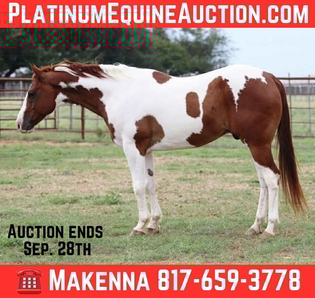 ONLINE AUCTION Place your bids at www.PlatinumEquineAuction.com Starting Bid $3500 Auction ends September 28th, 2025 Need a new saddle? Check out White Rock Saddles on our website or Facebook ✨ The Kind That Turns Heads & Wins Hearts ✨ Meet Poptart—the 8-year-old grade paint gelding with the kind of loud, flashy coloring that makes everyone stop and stare. He’s that once-in-a-lifetime pretty horse, but what makes him truly special is how kind, gentle, and easygoing he is to be around. Poptart has the kind of personality everyone wants in their pasture: sweet, uncomplicated, and always willing. He loves attention, stands quietly to be brushed and saddled, and makes you look forward to riding. Out on the trails, Poptart shines. He’s steady, quiet, and confident—the kind that will mosey along without a care in the world. He’s not in a hurry, doesn’t get hot, and goes wherever you point him without a fuss. He crosses water, steps over logs, and takes new scenery in stride. No, Poptart isn’t “fancy broke,” but he’s the type that makes riding enjoyable again. He’s smooth, uncomplicated, and doesn’t require a lot of buttons to have fun. Whether you’re looking for a relaxing weekend ride, a solid horse for your family, or just a pretty gelding to enjoy, Poptart will fit the bill. Here are some highlights about Poptart: • 8 years old – prime age with many years ahead • Gentle & easygoing – perfect for a laid-back ride • Stunning paint coloring – guaranteed to turn heads • Trail ready – happy to go wherever you point him • Uncomplicated – simple, fun, and reliable We’re located in Lipan, Texas, but don’t let distance stop you—we have reputable, nationwide haulers available, including routes to Hawaii and Canada. Call or text Makenna Hartzell 817-659-3778 for more information. ONLINE AUCTION Place your bids at www.PlatinumEquineAuction.com Starting Bid $3500 Auction ends September 28th, 2025 Need a new saddle? Check out White Rock Saddles on our website or Facebook