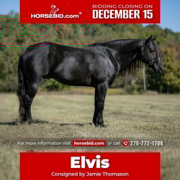 🎄𝐓𝐇𝐄 𝑯𝒐𝒍𝒊𝒅𝒂𝒚 𝐂𝐋𝐀𝐒𝐒𝐈𝐂🎄 Happening now thru MONDAY | DECEMBER 15th - Available EXCLUSIVELY on HorseBid's website! For more details and to register visit: www.Horsebid.com CONSIGNOR CONTACT: Jamie Thomason 270-772-1706 LOCATION: Auburn, KY BREED: AQHA REGISTERED: Yes REGISTERED NAME: IMA DRIFTWOOD 1602 COLOR: Smokey Black HEIGHT: 14.2 AGE: 9 GENDER: Stallion The perfect horse! Family friendly, safe for anyone, the kind everyone wishes they had in their barn. Elvis is as versatile as he is dependable. Whether you’re heading out for a relaxing trail ride, letting the kids climb on for an afternoon adventure, or backing into the box, he’s ready to go to work with a calm, steady attitude. He’s been used for lessons, carried non-horsey guests, tie-down roping, heading, heeling, breakaway, and ranch work, proving himself as a solid, trustworthy partner in and out of the arena. A true gentleman through and through, he handles every situation with patience and confidence. This horse isn’t just another mount — he’s the kind you can count on day after day, a loyal partner, and a true friend. Elvis is a 9 yr old, Smokey Black, AQHA Stallion, standing 14.2 hands. A deluxe trail mount, Elvis will go absolutely anywhere you point him. Zero spook & Confident, sure-footed, and steady, he’s been ridden on countless trails and overnight camping trips, always taking everything in stride. Whether you’re winding through wooded paths, crossing creeks, climbing hills, in town, through traffic or riding out across open country, he moves out willingly and safely for riders of any level. He’s the kind you can relax and enjoy the ride. In the arena, Elvis had been hauled to every setup. Indoor & outdoor, even to ranch rodeos. On the head side, been used for 12 point ropings and down. Good for the 8 point ropings on the heel side & ready to haul in the tie down & breakaway roping. Elvis has been used on a seed stock cattle operation his entire life. Accustomed to all aspects of ranch work. Tagging & doctoring calves, gathering strays, & working along stock dogs. Always honest & an asset to his partner. Everyone loves Elvis! He has been the spotlight of several senior photos sessions, this guy belongs on the movie screen! He’s gorgeous, “The King” of the barn. Visitors always stop by his stall to admire his beauty. We are often asked why Elvis was kept a stallion. You wouldn’t know he was a stallion. He is quiet, pastures, stalls, hauls, and stands tied along side mares. He passes the same calm, quiet, willing demeanor, as well as stunning looks on to his foals. He carries a dilute gene, was bred to a few select mares, and has sired palomino roans, bay roans, sorrels, and black foals. Each and every one have possessed the same great qualities that we admire in Elvis. If owning a stallion or breeding isn’t in your future plans, there are no contraindications in having Elvis gelded if you wish. If you would like to meet Elvis prior to adding him to your family, we’d be glad to have you. Arena, trails, & live cattle available. Elvis sells current on all cares, PPE’s welcome, & we can provide assistance in arranging transportation to anywhere!