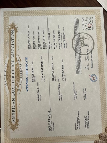 **For Sale: Premier Quarter Horse Stallion with Champion Bloodlines** Meet our exceptional American Quarter Horse stallion, born in 2009. This striking chestnut beauty stands at 15 hands high and is a true testament to the breed's versatility and strength. His striking color and well-muscled build make him a standout in any setting. Solo Payola has the potential to father racing champions given his bloodline. He'd also make a great companion for someone who wants to train him for trail riding, barrel racing, and more. Essential addition to your breeding program. Registered with the American Quarter Horse Association Family Background - Sire (Senior Polo) Senior Polo is the direct offspring of Mr. Jess Perry, who lifetime earnings of $687,000 on the racetrack and currently has a fee of $10,750. He is a World Champion sire and ranks as the #3 all-time sire of money earners. - Dam (Payola Special) Payola Special is the daughter of Strawfly Special (1987). Competing against top horses over three seasons, Strawfly Special had 25 starts, earning $222,920 with 11 wins, including victory in a major stakes race. He was inducted into the American Quarter Horse Hall of Fame in 2017. Don’t miss out on the opportunity to own this remarkable horse. Contact us today for more information and to schedule a visit!