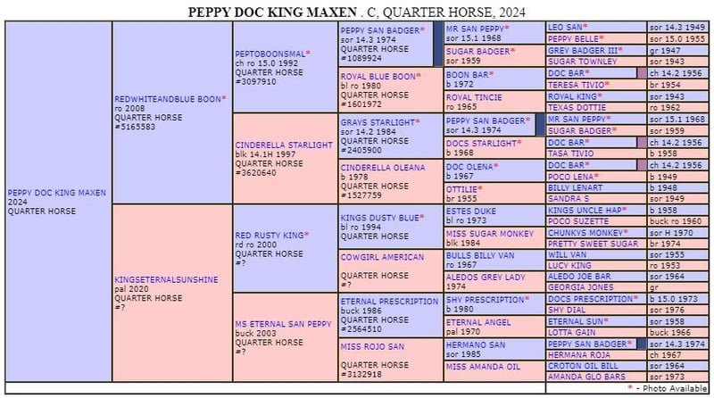 Peppy jest prawidłowo zbudowany i zorientowany na ludzi. Jego topowy rodowód po stronie ojca łączy się z doskonałymi cechami jeździeckimi po stronie matki. Jest wnukiem wartego 25 milionów dolarów reproduktora Peptoboonsmal. Jego przyrodnie rodzeństwo odnosi sukcesy w reiningu, cuttingu, jeździe ranczerskiej i cowhorse. Peppy ma w swoim rodowodzie 22% Peppy San Badger. Obecnie cieszy się życiem na dużym pastwisku. PEPPY jest uprawniony do startów w DQHA i regionalnych zawodach futurities. Jest przez nas starannie przygotowywany do swojego przyszłego życia przy użyciu metod Natural Horsemanship.