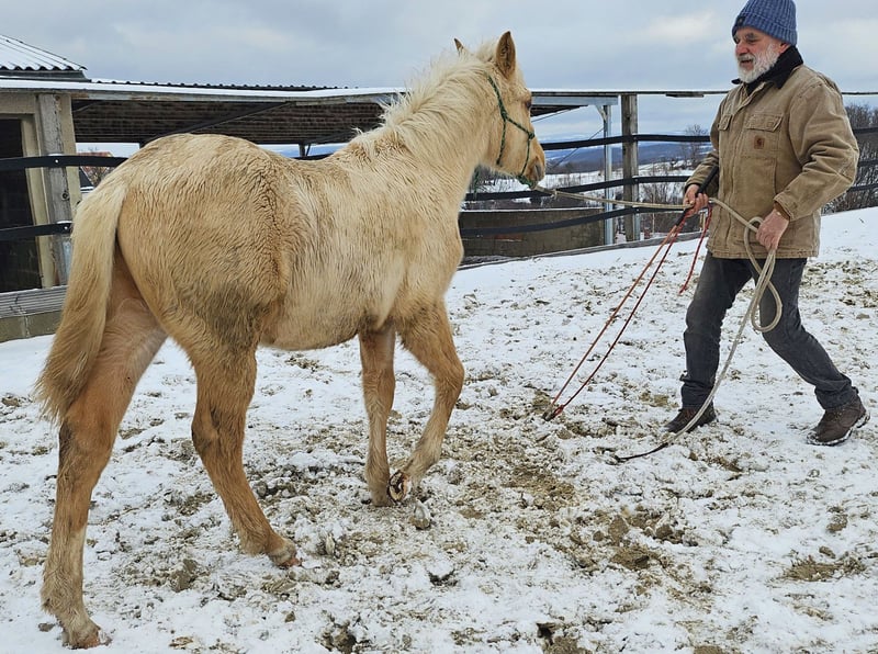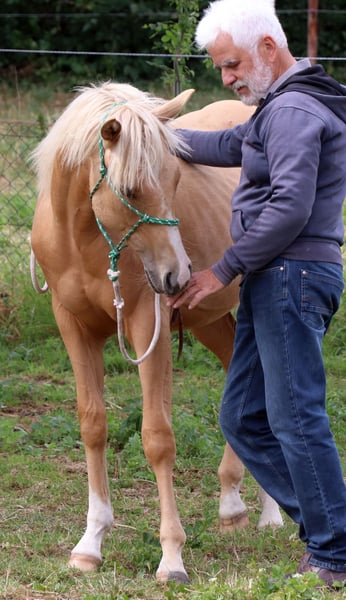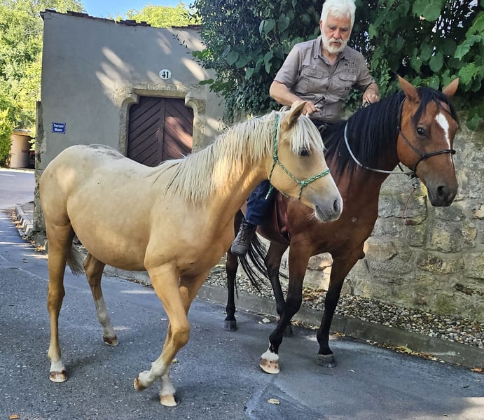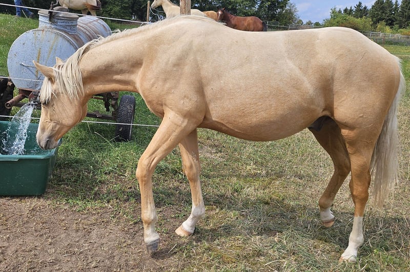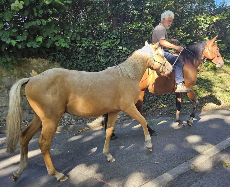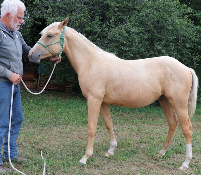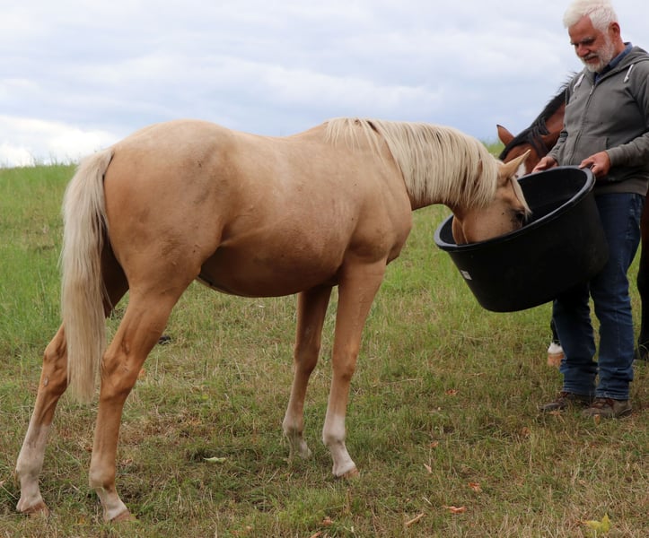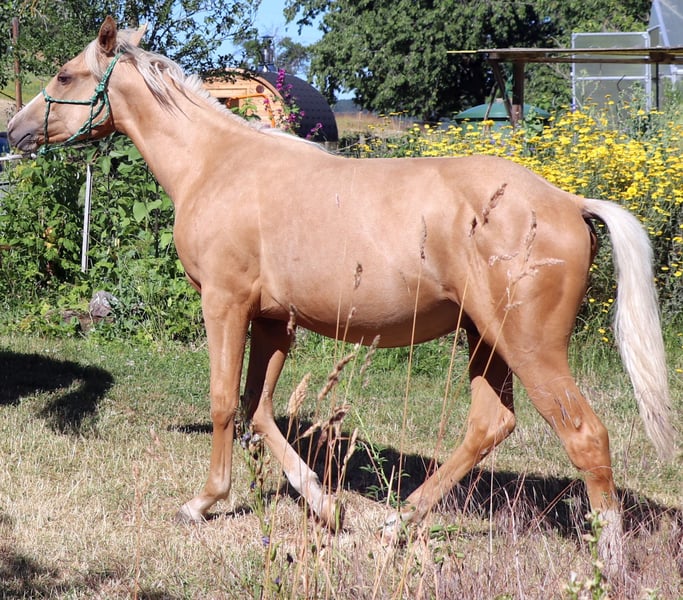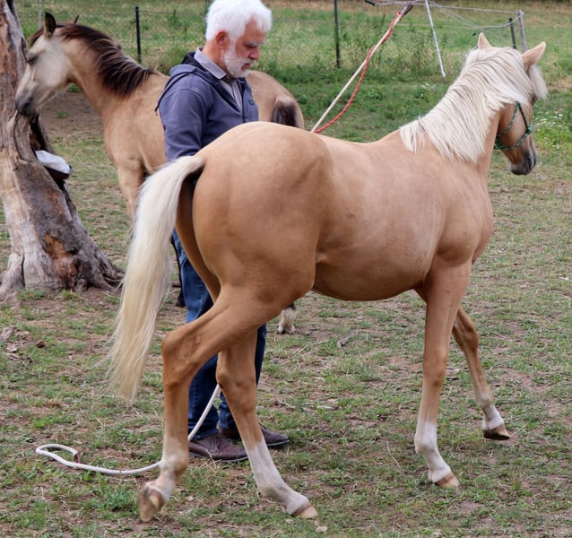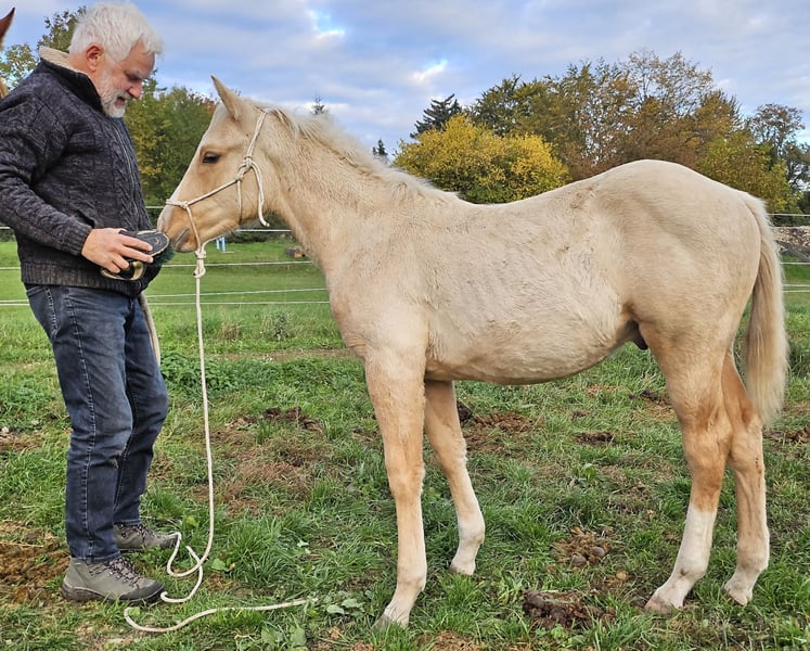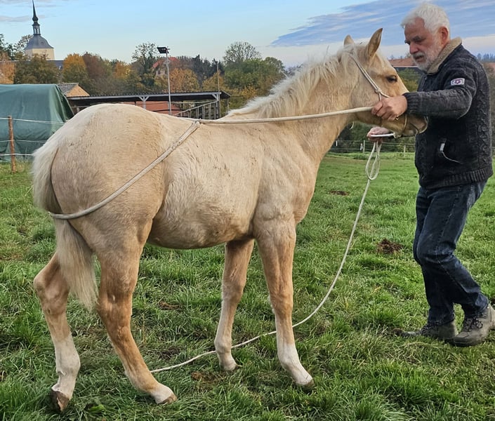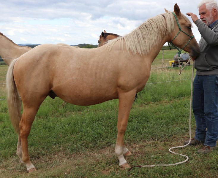 Peppy Doc King Maxen - This palomino, born in 2024 (final height approx. 148 cm), with a stunning white mane and tail, is an absolute eye-catcher - compact, correctly built, and with promising proportions. A young horse that impresses not only with its appearance but also with its wonderful character. He is people-oriented, friendly, attentive, and eager to learn. In daily handling, he is well-behaved, relaxed, and uncomplicated. He faces challenges with courage and curiosity and learns quickly. Even now, he can be loaded without any issues and walks calmly and confidently on a lead in the terrain. The stallion is growing up healthy and robust in a mixed herd in an open stable and is lovingly and knowledgeably introduced to his tasks as a riding horse - according to the principles of Natural Horsemanship, step by step and without time pressure. His color genetics (e/e, A/a, CH/ch) not only make him particularly interesting in color but also open up breeding potential. Peppy is vaccinated according to his age and regularly dewormed. His pedigree leaves nothing to be desired: top cutting lines (grandson of Peptoboonmal) on the paternal side meet excellent riding qualities on the maternal side - an ideal combination for sport, competition, and leisure. The stallion is eligible for DQHA as well as Regional Futurity and has everything it takes to become a versatile riding horse with charm, talent, and heart in the future.
