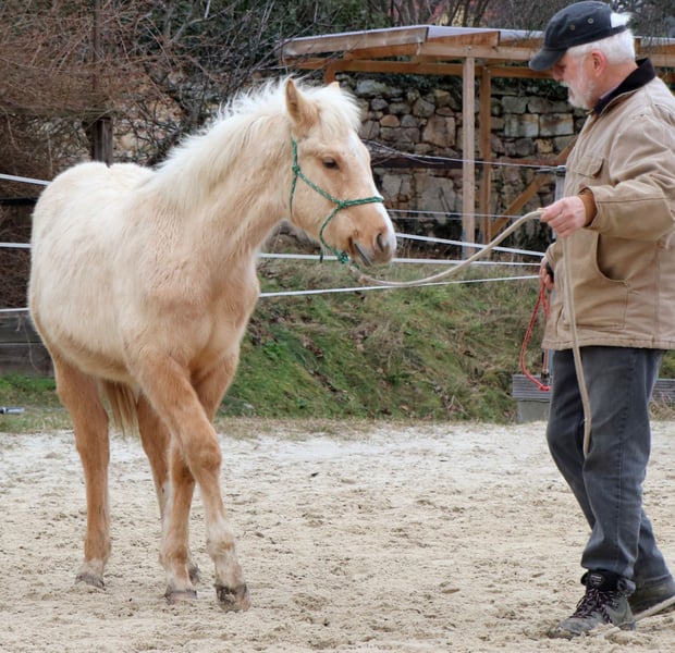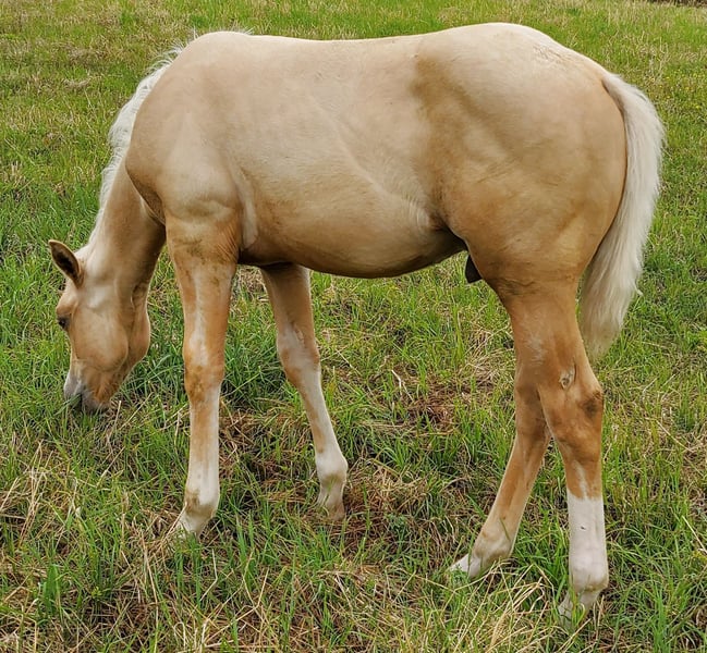 Peppy Doc King Maxen - Dieser 2024 geborene Palomino (Endmaß ca. 148 cm) mit traumhafter weißer Mähne und Schweif ist ein absoluter Eyecatcher - kompakt, korrekt gebaut und mit vielversprechenden Proportionen. Ein Nachwuchspferd, das nicht nur durch seine Optik, sondern auch durch seinen tollen Charakter überzeugt. Er ist menschenbezogen, freundlich, aufmerksam und lernwillig. Im täglichen Umgang zeigt er sich artig, entspannt und unkompliziert. Herausforderungen begegnet er mit Mut und Neugier und lernt schnell. Schon jetzt lässt er sich problemlos verladen und geht ruhig und gelassen an der Hand ins Gelände. Der Hengst wächst gesund und robust im Offenstall in gemischter Herde auf und wird liebevoll und mit viel Sachverstand an seine Aufgaben als Reitpferd herangeführt - nach den Prinzipien des Natural Horsemanship, Schritt für Schritt und ohne Zeitdruck. Die Farbgenetik (e/e, A/a, CH/ch) macht ihn nicht nur farblich besonders interessant, sondern eröffnet auch züchterisch Potenzial. Peppy ist altersgemäß geimpft und regelmäßig entwurmt. Seine Abstammung lässt keine Wünsche offen: Top Cuttinglinien (Enkel von Peptoboonmal) väterlicherseits treffen auf ausgezeichnete Reiteigenschaften mütterlicherseits - eine ideale Kombination für Sport, Turnier und Freizeit. Der Hengst ist DQHA sowie Regional-Futurity startberechtigt und bringt alles mit, um in Zukunft ein vielseitig einsetzbares Reitpferd mit Charme, Talent und Herz zu werden.