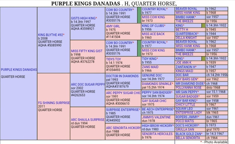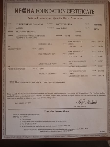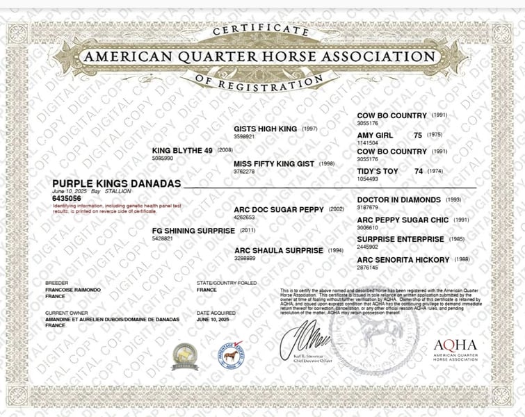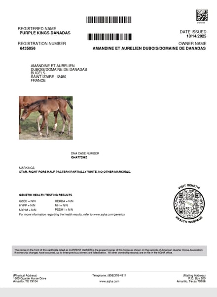 Purple Kings Danadas – Poulain Quarter Horse à vendre Né en juin 2025, Purple Kings Danadas est un superbe poulain Quarter Horse, alliant pedigree d’exception, modèle puissant et excellent mental. Il est le fils de King Blythe 49, étalon d’origine ranch importé des États-Unis, reconnu pour transmettre rusticité, mental froid et aptitudes polyvalentes. Il présente notamment 49 % de sang de King P-234, étalon fondateur emblématique de la race Quarter Horse, célèbre pour avoir transmis solidité, intelligence et un sens du bétail hors pair. Sa mère, FG Shining Surprise, est une jument au modèle impressionnant avec un très gros gabarit, apportant puissance, ossature et présence. Son pedigree met en avant plusieurs grands étalons reconnus comme Shining Spark, Peppy San Badger ou High Brow Hickory 👉 Caractéristiques : • Nom : Purple Kings Danadas • Robe : Seal Brown • 92 % NFQHA (gros pourcentage de sang fondation) • Taille estimée : environ 1m55 • Modèle : beaucoup de masse, osseux, harmonieux • Poulain avec du sang, tout en restant posé et réfléchi • 👉 Manipulation & soins : Purple Kings Danadas est un poulain bien manipulé : travail en main de base acquis, donne les pieds, habitué au pansage et à la présence humaine. 👉 Santé : Il est à jour de : • Vermifuge • Parage • Ostéopathie • Vaccins Testé négatif sur les 7 panels génétiques 👉 Mode de vie : Élevé dans des conditions idéales, il vit en troupeau avec juments, poulains et étalon, ce qui lui assure un excellent équilibre mental et social. 👉 Statut : Actuellement entier, il pourra être castré sur demande. Un poulain prometteur, alliant génétique solide, modèle puissant et mental sain, idéal pour un projet polyvalent ranch, comme futur reproducteur ou loisir de qualité. Prix : 7 5 🥕🥕 Domaine de Danadas Bucels 12480 Saint Izaire Notre sélection pour l’élevage de Quarter Horses s’inscrit dans une recherche constante de chevaux rustiques, sains et fonctionnels, élevés dans des conditions respectueuses de leur bien-être. Élevage professionnel, nous accordons une attention particulière à la qualité de vie de nos animaux : nos juments vivent au pré toute l’année, sur de grandes parcelles avec des abris naturels, et sont complémentées en foin bio lorsque nécessaire ainsi qu’avec un CMV de qualité. Nous privilégions des chevaux aux pieds solides et fonctionnels, capables de durer dans le temps. Au-delà du modèle, nous recherchons avant tout la disponibilité au travail, la rusticité et la facilité au quotidien : des chevaux fiables, aussi bien pour une balade dominicale que pour un week-end en compétition ou le travail au troupeau sur nos 130 hectares. Notre programme s’appuie sur des lignées « foundation », avec des origines autour du légendaire King P-234 et de Blackburn , reconnues pour leur mental, leur robustesse et leur fonctionnalité. Nos poulains grandissent dans le respect de leur nature : ils vivent en troupeau, aux côtés des juments, des autres poulains et de l’étalon, favorisant ainsi un développement physique et mental équilibré. Ils bénéficient d’un suivi complet (ostéopathie, shiatsu énergétique, parage, suivi vétérinaire, vermifugation et nutrition) et nous leur inculquons les bases d’éducation à leur rythme, en douceur. Nous pratiquons des sevrages tardifs, généralement entre 10 et 12 mois, afin de préserver leur équilibre. À travers cette approche globale et rigoureuse, notre objectif est de produire des poulains faciles, solides, rustiques et bien dans leur tête, capables de s’adapter durablement aux exigences du travail comme à celles du quotidien