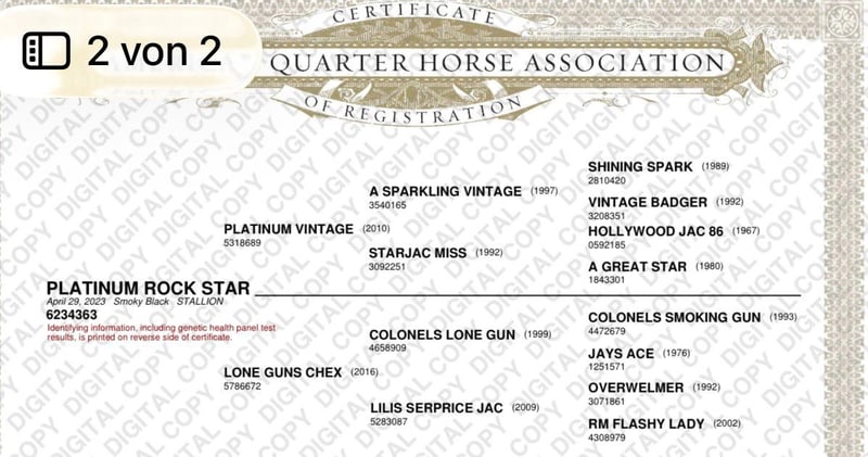 Platinum Rock Star Platinum Vintage x Lone Guns Chex Color test, pedigree see pictures NRHA Germany/EUR registration paid For further information, please contact us exclusively by phone at 0151-16592815