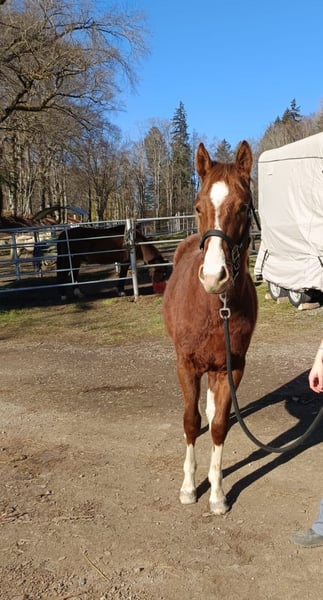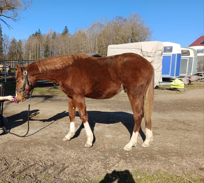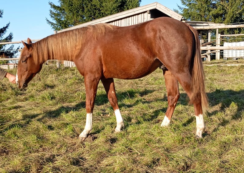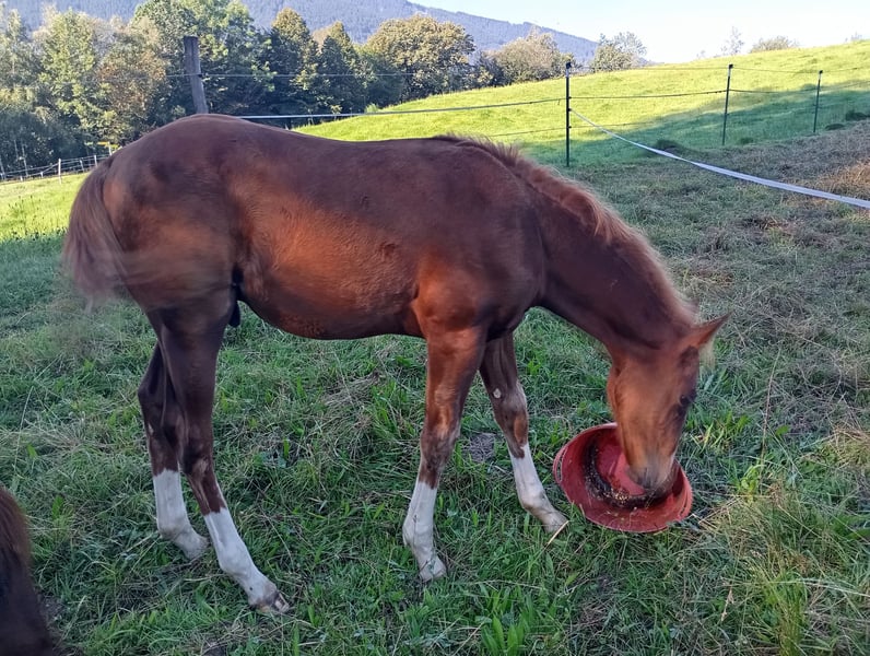 QH stallion born 13.04.24, 6 panel N/N via the parents, sorrel, "Murphy" is a very curious, people-oriented and fearless little stallion, he grows up with us in a species-appropriate manner in the herd on large pastures. He will be sold in the fall after weaning, of course with AQHA paper and equine passport, he can also stay with us for further breeding by arrangement, NRHA Germany and Euro will be paid. Due to his pedigree he is very interesting not only for reining but also for cowhorse. Further information by phone