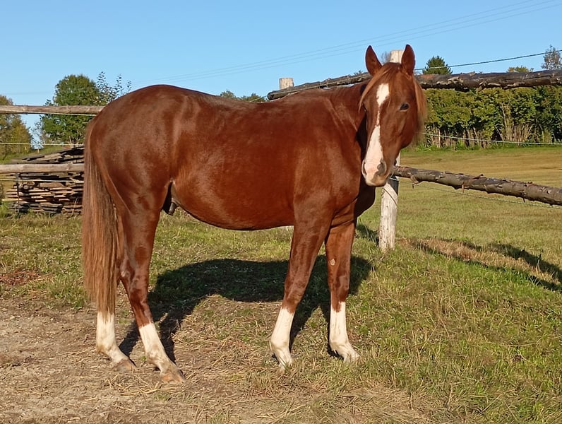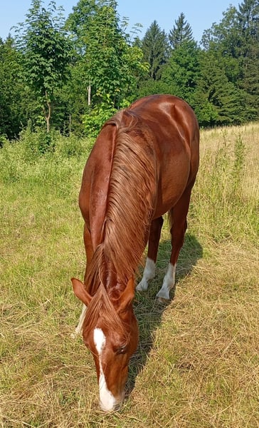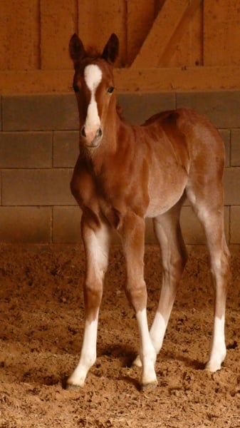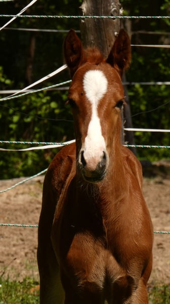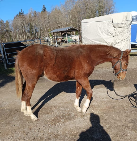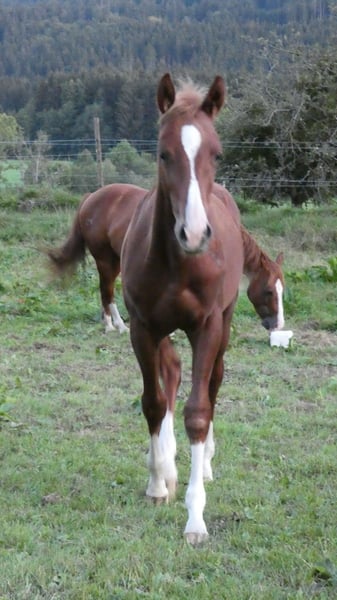 Étalon Quarter Horse né le 13/04/2024, 6 panels N/N via ses parents, coloris sorrel. « Murphy » est un petit étalon très curieux, proche des humains et intrépide. Il grandit chez nous de manière adaptée, avec d’autres jeunes étalons, en pâture sur de vastes terrains. Il possède bien sûr des papiers AQHA et un passeport équin. Si souhaité, il peut également rester chez nous pour une croissance supplémentaire, après accord. Son pedigree est enregistré auprès de NRHA Germany et Euro. En raison de sa lignée, il est particulièrement intéressant non seulement pour la Reining, mais aussi pour le Cowhorse. Pour plus d’informations, n’hésitez pas à nous contacter par téléphone.