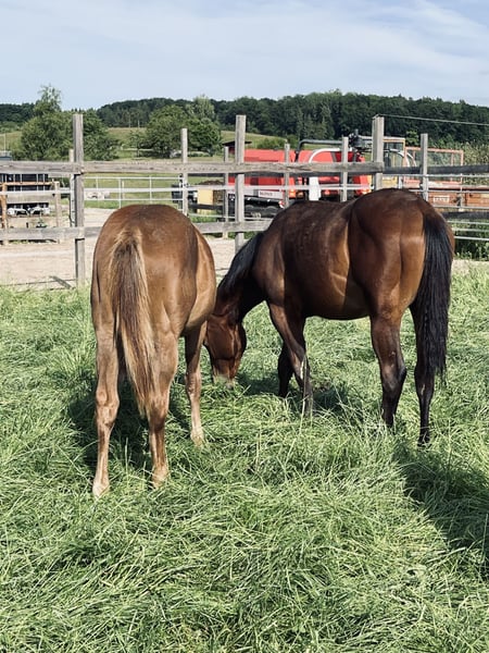 For our "BEN" (ZIPPOS BENTLEY RIDE) we are looking for a 5 star home. The smart Quarter Horse stallion (born 2024) was born on our farm. His parents are also on our farm: Dam: ZIPPYS GLAMOURDONNA Sire: Zippos King Bar BEN is our little muscle pack. He impresses with his elegant and timeless appearance. He has a very correct conformation and is blessed with an outstanding gait. He is suitable for both competition and leisure. He is currently still being bred with his dam and has foals of the same age to play with. He has learned everything you need to know at this age: Giving hooves, grooming, showering/washing, leading by halter. Ben is wormed regularly, has a DQHA equine passport and the American papers (certificate of registration) from the AQHA. He can either stay here for further breeding or move to his new home. If you would like to get to know Ben, just write to us.