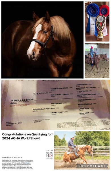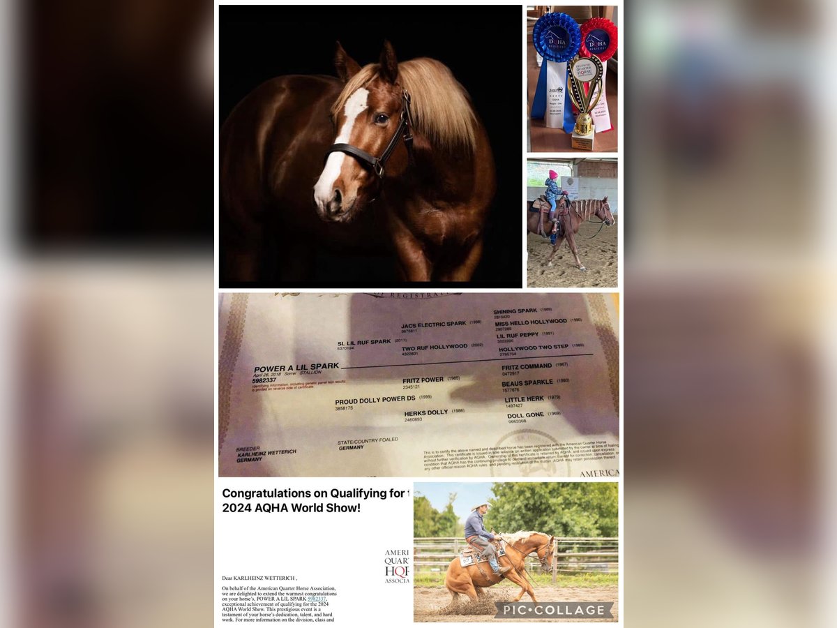🐴🫶 For Sale ❤️ Quarter Horse Stallion for Sale POWER A LIL SPARK Born: April 26, 2018 Sire: SL LIL RUF SPARK Dam: PROUD DOLLY POWER DS "Leftie" was bred on our farm and grew up naturally in a herd on his own foal paddock. In 2021, he began training with Jürgen Malo! http://www.logisches-pferdetraining.de He consistently demonstrated motivation and a willingness to learn! He is versatile and can be used in reining, working cow horse, and all-around disciplines! "Leftie" is ready to show! Achievements 2023: - 2nd place NRCHA Hackamore - 3rd place Q23 DQHA German Junior Cow Horse Championship - 3rd place FEQHA European Junior Cow Horse Championship He has also competed at smaller shows, consistently placing (RBC, EWU, etc.). This year, Leftie spent another four months in training with Jürgen Malo! He has an incredibly lovable character, is naturally blacksmith and loading friendly, and remains completely calm under pressure! Absolutely no stallion manners! We can easily see Leftie excelling in ranch versatility, but he also does a fantastic job with cattle and in reining!