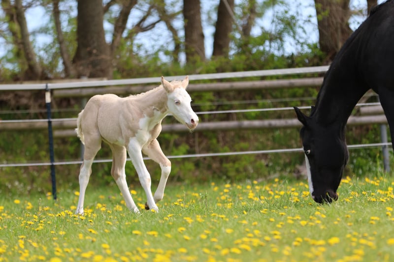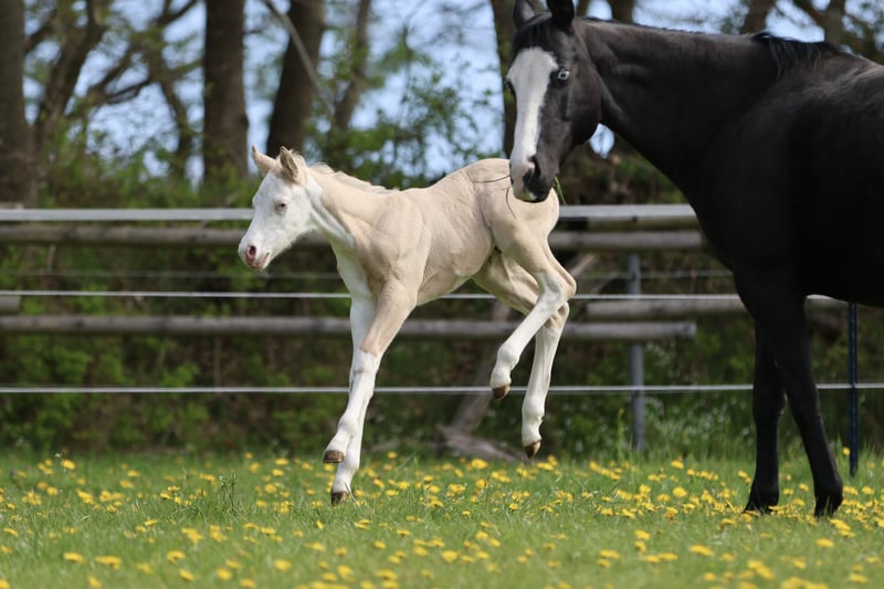 Bodie – Ein besonderes Hengstfohlen in der schönen Farbe Dunalino Splash White (ee aa Dd Crcr SW1 SW2) mit zwei blauen Augen. Am 23.04.25 hat er das Licht der Welt erblickt. Bodie begeistert nicht nur durch seine seltene Farbe, sondern auch durch sein kräftiges Gebäude, schöne Bewegungen und sein offenes, neugieriges Wesen. Er zeigt sich jetzt schon sehr menschenbezogen und aufmerksam, beste Voraussetzungen für eine vielversprechende Zukunft! Sire: Shining C Amar Amar stammt aus der weltbekannten Zucht von Cassidy Huckeba, Shining C Grulla Horses und wurde 2019 aus Texas importiert. Vollbruder zu: Splash in Diamonds – 2018 APHA World Championship Show, Top 5 Junior Working Cowhorse as a 3 year old Dam: Black Guns Please Blueys Mama ist ebenfalls aus den USA importiert und eine Tochter von No Guns Please. 2001 AQHA stallion by Chic Please out of the legendary mare, Katie Gun! LTE $25,000+, 337+ AQHA Points in Reining, Cow Horse, Heading, Heeling, and Tie-Down roping. Er erhält Papiere der AQHA & APHA sowie einen DQHA-Pass. Bodie ist selbstverständlich 7-Panel negativ. Er wächst artgerecht im Herdenverband auf, kennt das Fohlen-ABC beim Auszug und wird regelmäßig entwurmt, mit hochwertigen Mineralien versorgt und dem Hufschmied vorgestellt. Die Fotos zeigen ihn nur wenige Stunden nach der Geburt, wer ihn live erleben möchte, ist herzlich eingeladen, vorbeizukommen und sich selbst ein Bild zu machen!