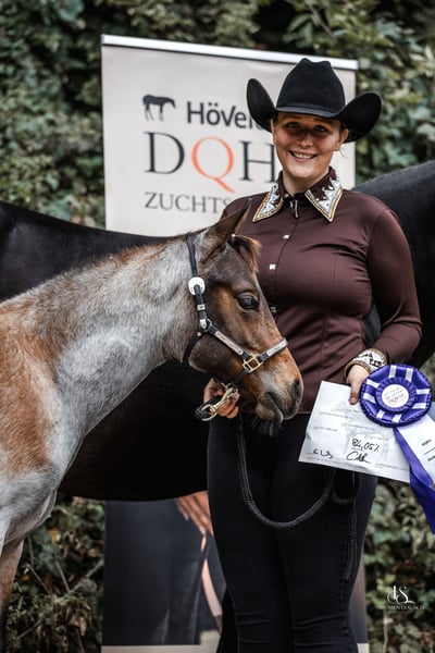 AQHA Colt – Bay Roan – "Peanut" Pleasure & Allround Prospect with Top Pedigree On April 26, 2025, our Hazel gave birth to a very special colt: Peanut – a beautiful, correctly built Bay Roan with great presence, clear movements, and a friendly yet brave temperament. Even in his first days, Peanut is showing his expressive gaits, a lot of balance, and remarkably good transitions. He has the talent to develop into a promising Pleasure and Allround horse for higher-level competition. He will surely also be interesting for Western Riding – he transitions very flat and cleanly. Peanut is already loading well into the trailer, walks along the main road, is familiar with all kinds of motorized equipment, and bathing is also no problem. He has also mastered his first farrier appointment with flying colors. He is super unflappable, brave, and very people-oriented. Pedigree: Peanut is sired by You Rock My World (1.60 m) × TFR A Goodbar Deluxe (1.54 m). A look at his pedigree speaks for itself: The Rock, RL Best Of Sudden, Ive Got Good Credit, Dynamic Deluxe, and Assets Good Rebel – all wishes are fulfilled here. Raising & Care: Peanut is being raised in a species-appropriate manner on spacious pastures in summer and dry areas in winter. Mother and foal are regularly dewormed and provided with high-quality minerals and vitamins. The well-being of our animals is our top priority, and nothing is spared! Further Information: Born: April 26, 2025 Color: Bay Roan Insured (Life & Surgery) Available from around November (after careful weaning), but he can stay longer by arrangement. Hazel, Peanut's mother, is 6 years old, healthy, people-oriented, and absolutely reliable – so much so that my little niece was already able to ride her safely at the age of 4. At the North Futurity 2021, she already achieved success as a two-year-old: Reserve Futurity Champion 2yo Halter Reserve Futurity Champion Longe Line NSBA 2yo Longe Line AQHA 2yo Trail in Hand 5th Placings in Junior Pleasure, but due to my lack of time, she was not presented further. Peanut is an ideal young horse for sport and leisure with charm, quality, and the best foundation. If you are seriously interested, we look forward to a personal message or a call! It is definitely about space before price – we can surely come to an agreement here.