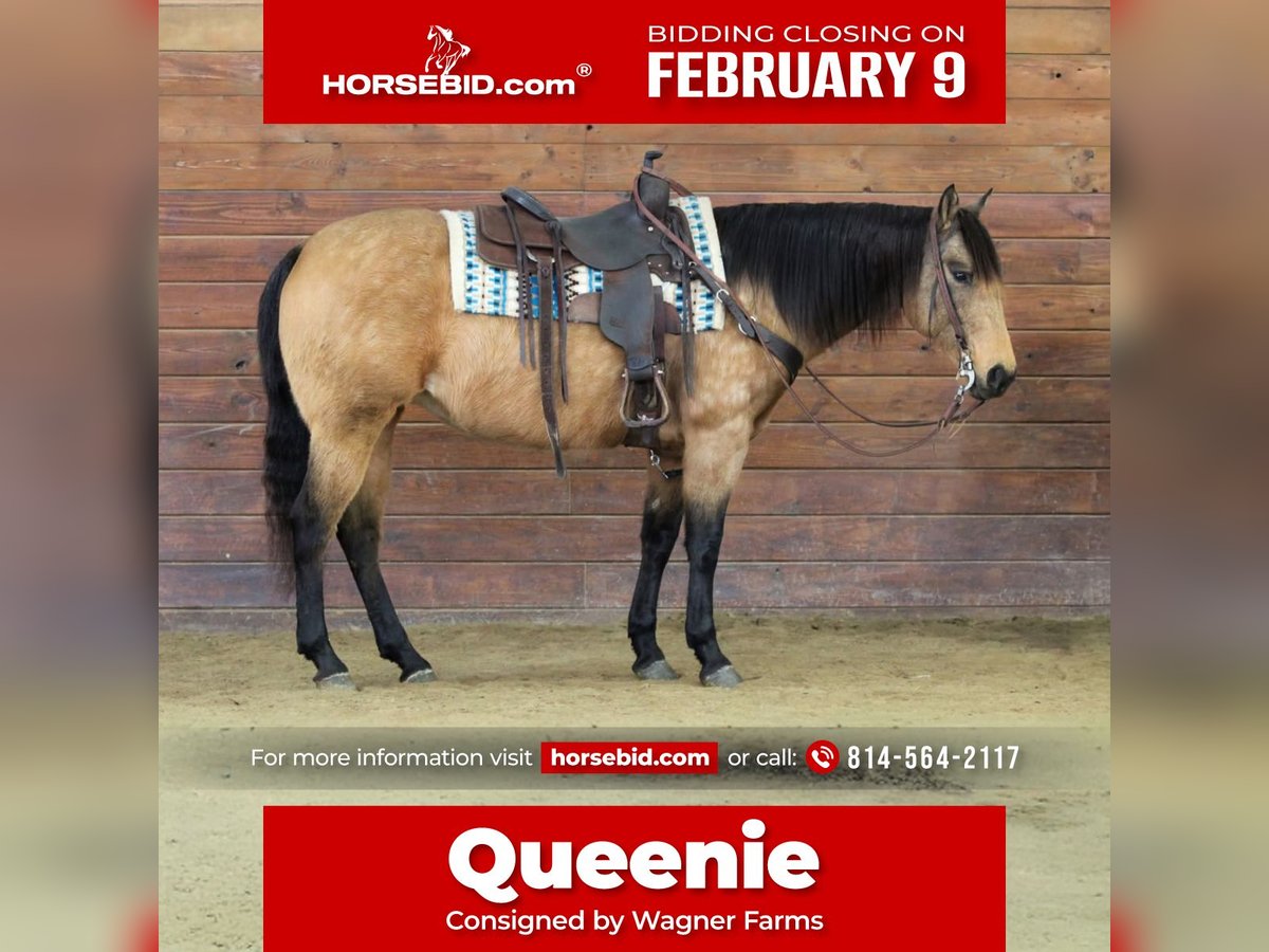❤️🔥𝑩𝒆 𝑴𝒊𝒏𝒆 𝐒𝐄𝐋𝐄𝐂𝐓❤️🔥 Happening now thru MONDAY | FEBRUARY 9th - Available EXCLUSIVELY on HorseBid's website! For more details and to register visit: www.Horsebid.com CONSIGNOR CONTACT: Wagner Farms 814-564-2117 LOCATION: Clarion, PA BREED: QH REGISTERED: No REGISTERED NAME: Queenie COLOR: Buckskin HEIGHT: 15 AGE: 10 GENDER: Mare Queenie is a 10 year Old Buckskin Quarter Horse Mare. She stands 15 hands tall. Wow Check Her Out! Queenie is one COOL HORSE!! Super Broke and Gentle For All Types of Riders! Finished and Been There Done That Trail Horse Deluxe! Also Finished Arena Horse and Finished Ranch Horse! Queenie is GREAT ON THE TRAILS! Goes anywhere you ask her to go and never hesitates. Thru the water , creeks, mud, snow you name it Queenie can handle it. She is excellent when it comes to working cattle on the ranch. Doctor , sort , check fences, drag calves to the branding fire . Shes seen the sights and heard the sounds . She has a nice walk , trot and canter in the arena and lopes nice circles each way. Pull her bridle off and ride her around with a rope around her neck. Ride her bareback! Carry the flag and teddy bear on her . Her Buckskin color and looks makes her look like she was in a old john wayne western movie! Dont Miss Out On Queenie! Super Good Looking, Safe and Gentle and Good Broke! Call or Text Glory at 814-564-2117. We can arrange delivery anywhere in the United States. Thank You and God Bless