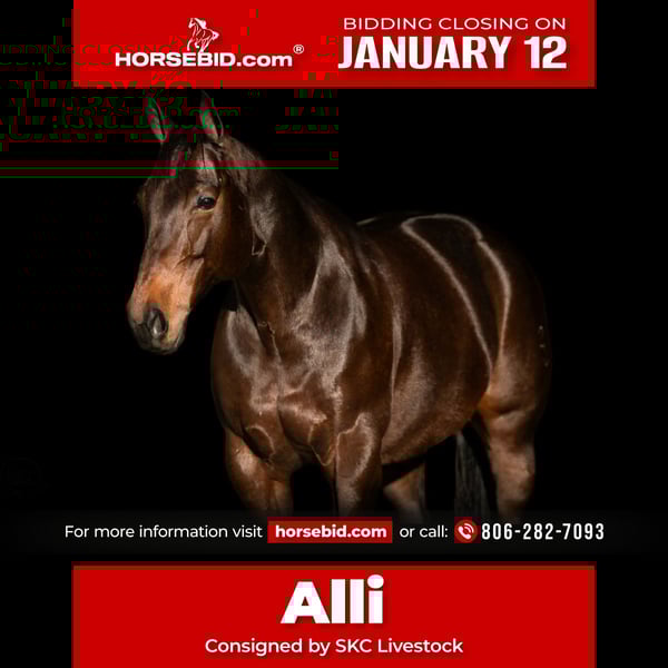 ♦️𝐍𝐄𝐖 𝐘𝐄𝐀𝐑'𝐒 𝑬𝒙𝒕𝒓𝒂𝒗𝒂𝒈𝒂𝒏𝒛𝒂♦️ Happening now thru MONDAY | JANUARY 12th - Available EXCLUSIVELY on HorseBid's website! For more details and to register visit: www.Horsebid.com CONSIGNOR CONTACT: SKC Livestock 806-282-7093 LOCATION: Canyon TX BREED: AQHA REGISTERED: Yes REGISTERED NAME: Alli Rey COLOR: Bay HEIGHT: 15 AGE: 10 GENDER: Mare